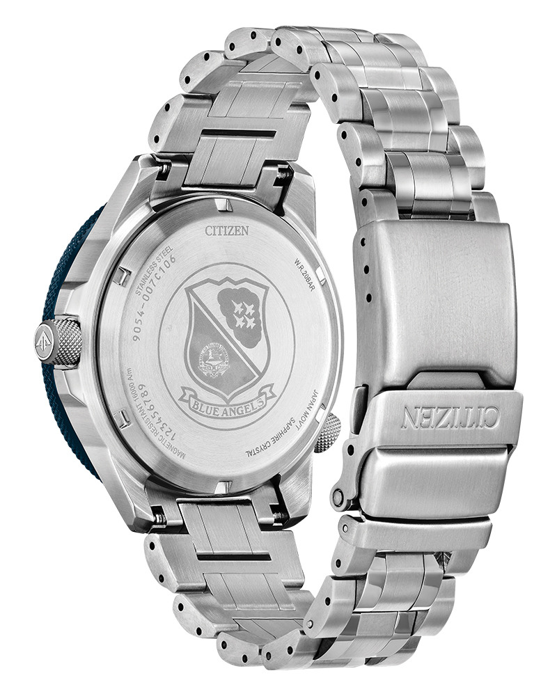 Um logotipo proeminente da Blue Angels está impresso no mostrador e gravado no fundo da caixa. O fundo da caixa gravado é mostrado claramente nas imagens que vazaram, juntamente com as marcas de referência e de resistência à água do modelo. A coroa e o controle secundário às duas horas usam texturas de metal serrilhado. No interior do relógio está o Calibre 9054 da Citizen https://calibercorner.com/citizen-caliber-9054/da Citizen, um movimento GMT automático com hacking de segundos e a capacidade de ajustar independentemente o ponteiro das horas local ao viajar. O relógio é equipado com um cristal de safira e uma pulseira de aço inoxidável com um fecho de botão de pressão com a marca gravada. A resistência à água é registrada em 200 metros.