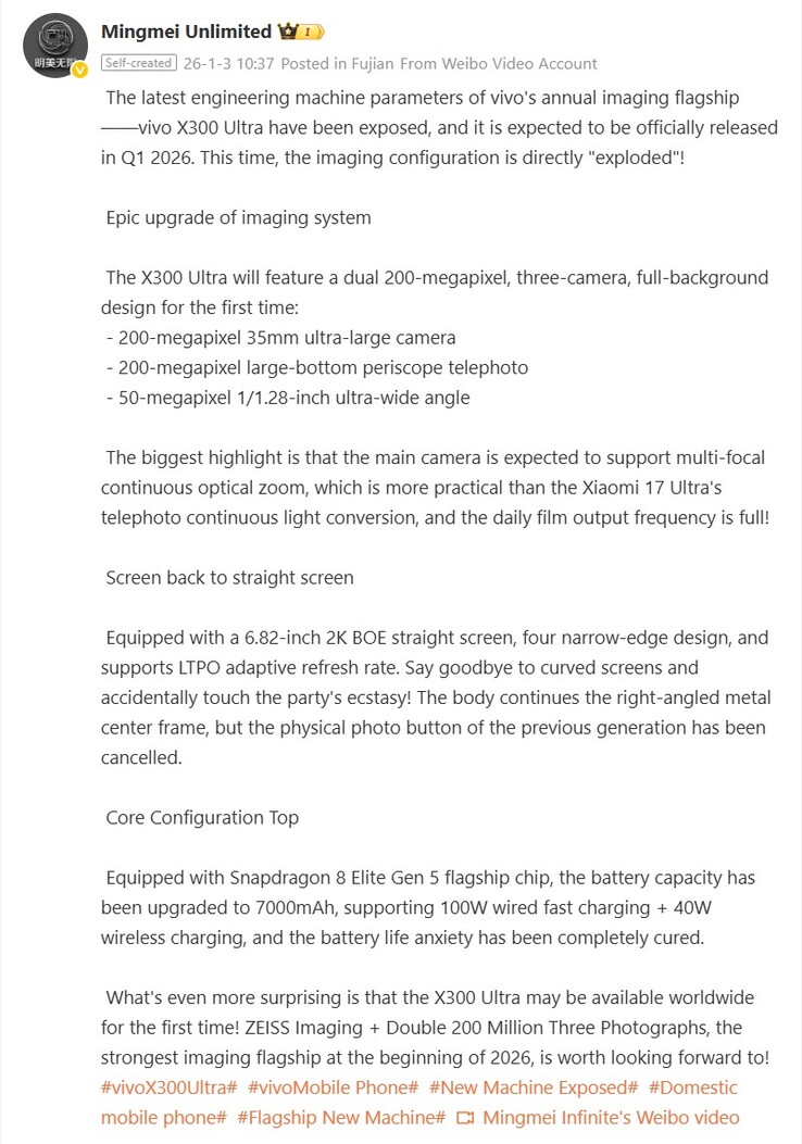 O primeiro fim de semana do ano nos traz um rumor bastante espetacular sobre o Vivo X300 Ultra, que deve ser o primeiro carro-chefe da Vivo Ultra a ser lançado globalmente e deve estrear no primeiro trimestre, provavelmente em março. De acordo com um usuário do Weibo (veja a captura de tela abaixo), o Vivo X300 Ultra terá uma câmera principal de 200 MP de 35 mm, uma câmera teleobjetiva periscópica de 200 MP e uma grande câmera ultra-wide de 50 MP de 1/1,28 polegadas, o que não é exatamente uma informação nova.