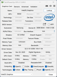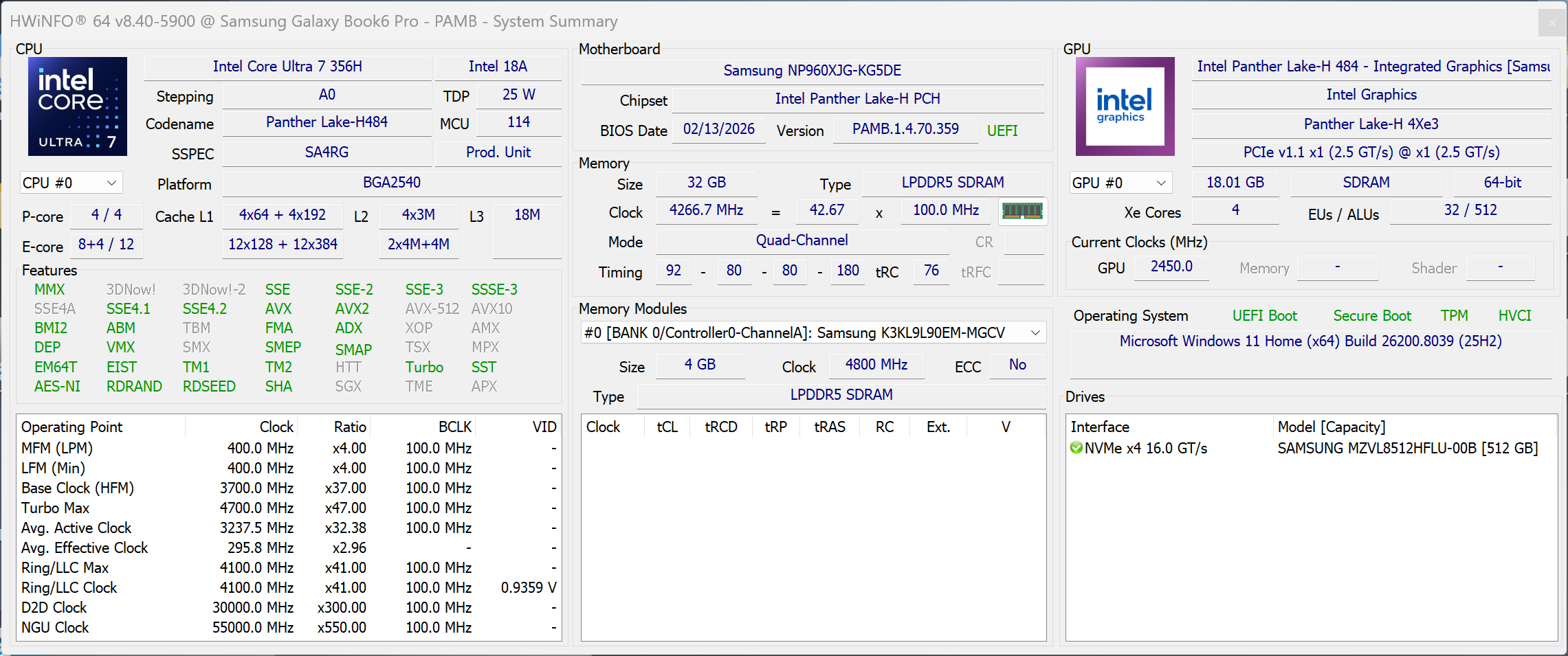 | Samsung Galaxy Book6 Pro Intel Core Ultra 7 356H ⎘ Intel Graphics 4 Xe3 Panther Lake iGPU ⎘ 32 GB Memória, 512 GB SSD | Preço de tabela: 2199€ | 1.6 kg | 11.9 mm | 16.00" 2880x1800 212 PPI OLED | |