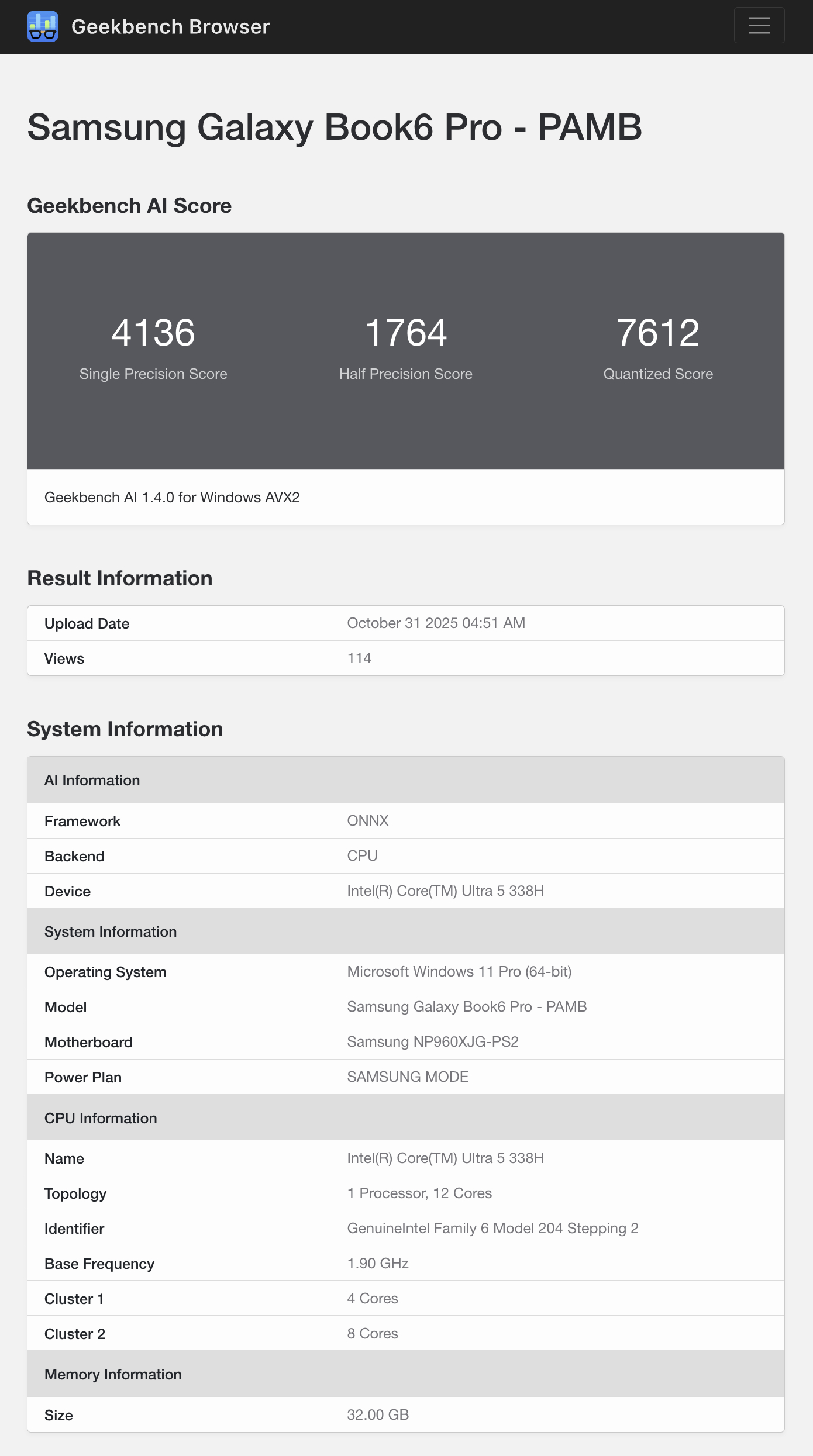 Agora, o Geekbench esclarece que pelo menos uma variante do Galaxy Book6 Pro também será fornecida com um processador Core Ultra 5 338H da família Panther Lake da Intel. Equipado com doze núcleos divididos igualmente entre desempenho, eficiência e clusters de baixo consumo de energia, o Core Ultra 5 338H é considerado mais eficiente do que os equivalentes Lunar Lake, como o Core Ultra 5 238V. Como resultado, o Galaxy Book6 Pro deve ter uma duração de bateria superior à dos modelos da série Galaxy Book5, como o Galaxy Book5 Pro 360 (atualmente em US$ 1.358 na Amazon).