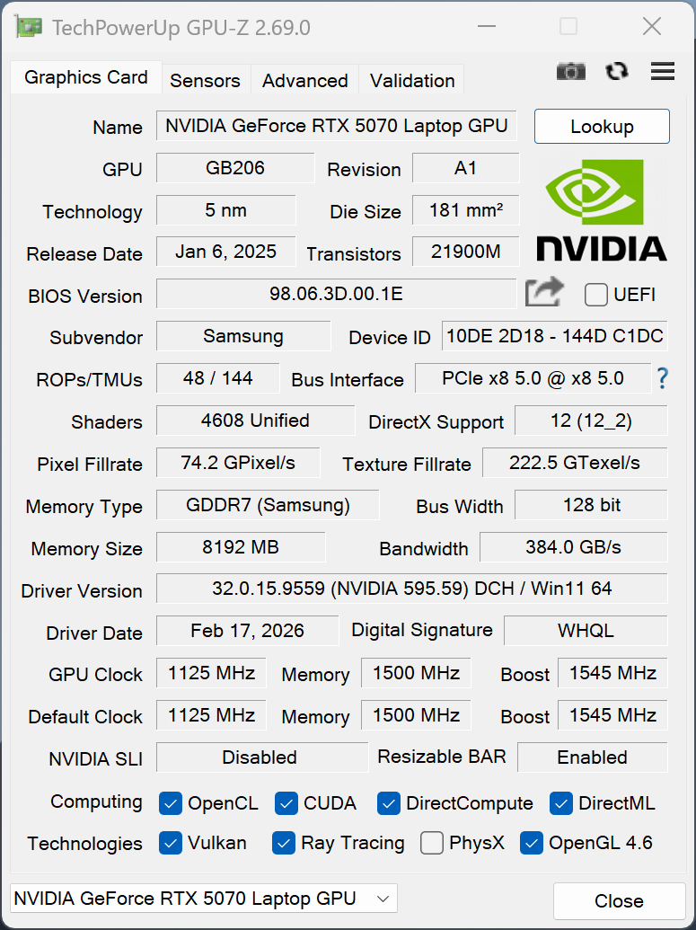| Samsung Galaxy Book6 Ultra Ultra 7 356H, GeForce RTX 5070 Laptop, Samsung PM9C1b MZVL81T0HFLB-00BH1, OLED, 2880x1800, 16" | Apple MacBook Pro 16 2024 M4 Pro M4 Pro 14-Core, M4 Pro 20-Core GPU, Apple SSD AP2048Z, Mini-LED, 3456x2234, 16.2" | Lenovo Yoga Pro 9i 16 RTX 5070 Ultra 9 285H, GeForce RTX 5070 Laptop, WD PC SN7100S SDFPMSL-1T00-1101, OLED, 3200x2000, 16" | Asus ProArt P16 RTX 5090 Ryzen AI 9 HX 370, GeForce RTX 5090 Laptop, Micron 2500 2TB MTFDKBA2T0QGN-1BN1AABGA, OLED, 3840x2400, 16" | Dell 16 Premium DA16250 Ultra 7 255H, GeForce RTX 5070 Laptop, Kioxia BG6 KBG6AZNV1T02, OLED, 3840x2400, 16.3" | Lenovo ThinkPad T1g Gen 8 21TD003GE Ultra 9 285H, GeForce RTX 5070 Laptop, Samsung PM9E1 MZVLC2T0HBLD, Tandem-OLED, 3200x2000, 16" | Média NVIDIA GeForce RTX 5070 Laptop | Média da turma Multimedia | |