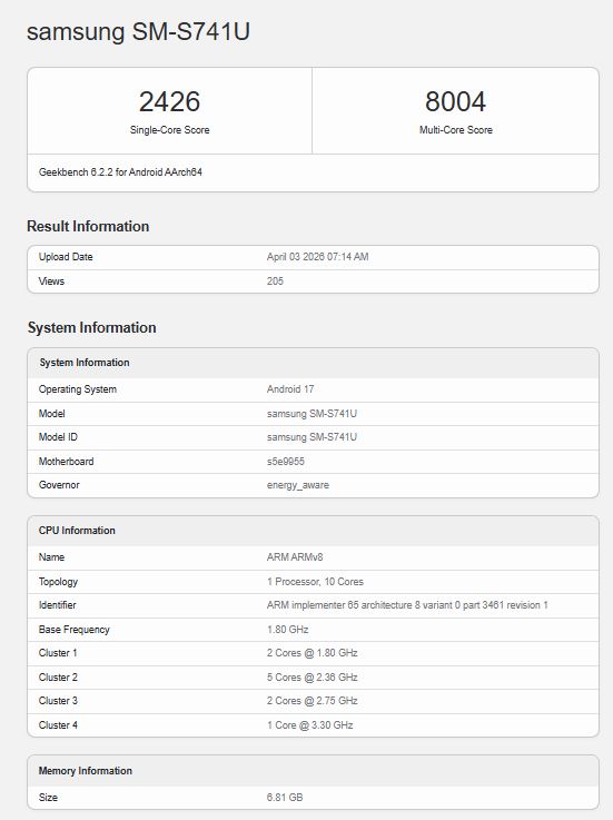 O telefone está listado com o número de modelo "SM-S741U", com 8 GB de RAM integrados e rodando em Android 17. Em termos de desempenho, ele obtém uma pontuação single-core de 2.426 e uma pontuação multi-core de 8.004. Esses dois números são um passo atrás em relação ao desempenho dos outros telefones da série Galaxy Telefones da série S26. Isso não é nenhuma surpresa, pois o chipset do dispositivo testado aqui parece ser o Exynos 2500e não o Exynos 2600 presente em alguns modelos do Galaxy S26.