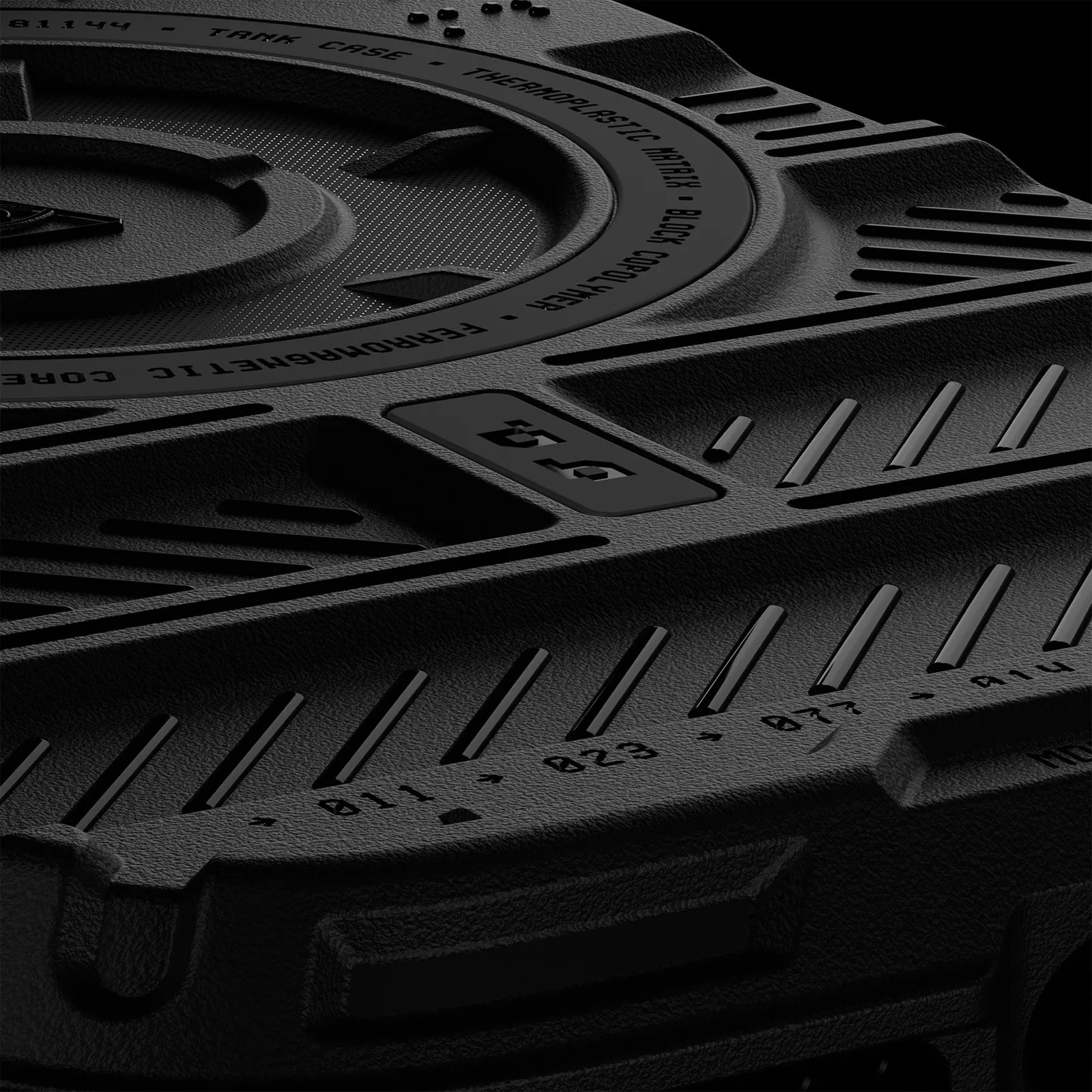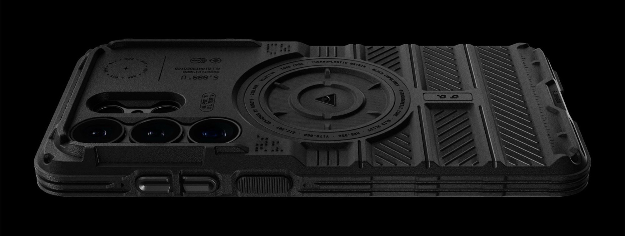 A capa Tank da dbrand apresenta um design "tático" marcante, com dez texturas de superfície diferentes, que tem o objetivo de tornar a capa não apenas excepcionalmente aderente, mas também mais tátil do que a maioria dos produtos concorrentes. O material relativamente espesso da capa foi projetado para oferecer excelente proteção para o Galaxy S26 Ultra contra quedas e arranhões. Os botões de volume e o botão liga/desliga são intercambiáveis, e a dbrand oferece esses botões em uma variedade de cores diferentes