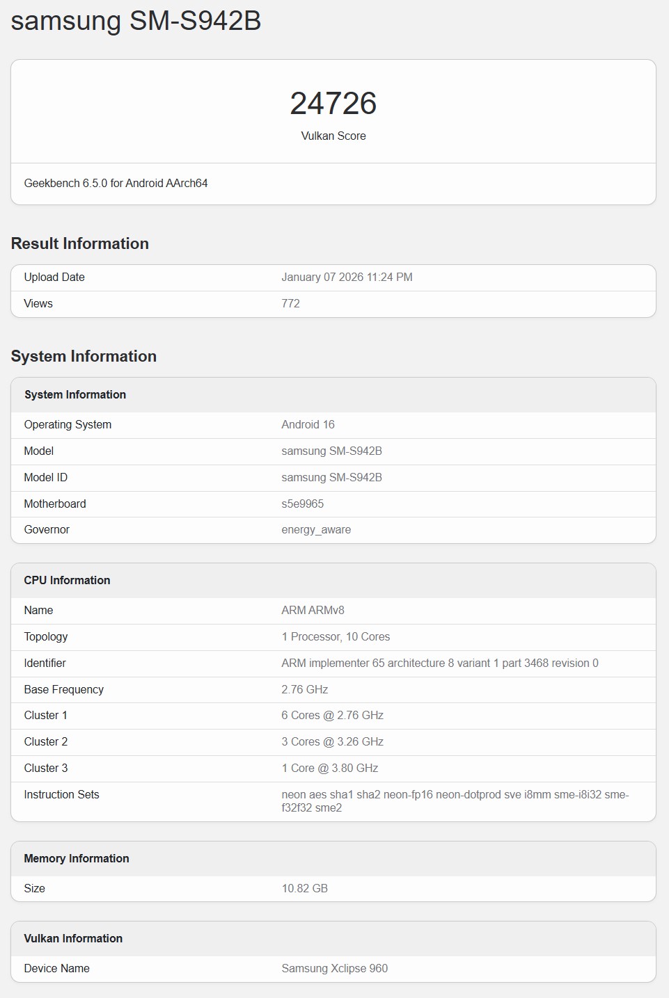 Os dispositivos de teste do Samsung Exynos 2600 já apareceram no Geekbench no passado e deram uma indicação do desempenho esperado da CPU. Agora, um smartphone Samsung com o número de modelo SM-S942B também apareceu no banco de dados do Geekbench. Espera-se que esse modelo seja o Galaxy S26 internacional. Como pode ser visto nas especificações, ele apresenta um SoC de 10 núcleos com o Samsung Xclipse 960, o que significa que é claramente o Exynos 2600. Essa também é uma dica bastante óbvia de que o Galaxy S26 europeu contará com o processador interno da Samsung.