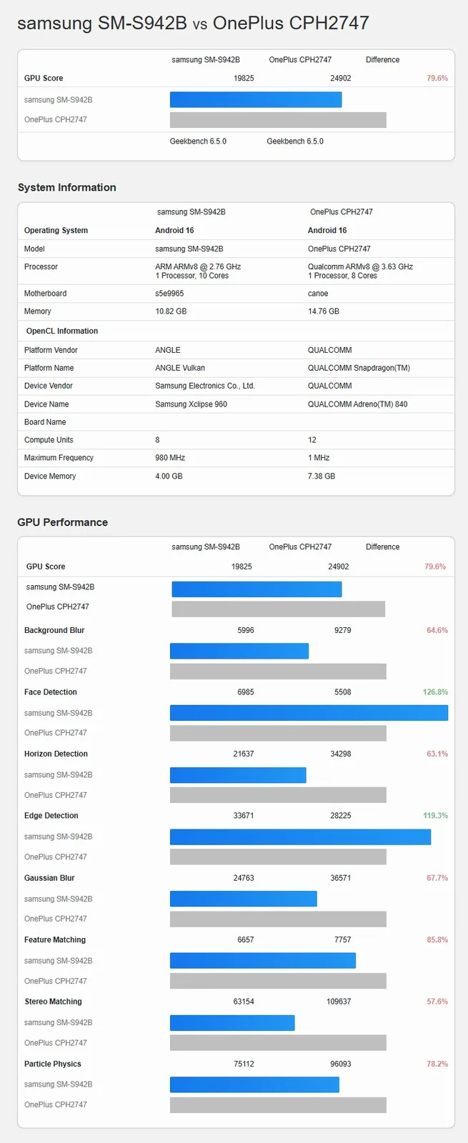 Nesse caso, não se trata de um benchmark de CPU, mas de um teste de GPU Vulkan e OpenCL. Nas primeiras unidades de teste, essa unidade gráfica se aproximou bastante do Snapdragon 8 Elite Gen 5, que é encontrado no OnePlus 15(a partir de US$ 999 na Amazon) e em outros telefones Android. A comparação não é totalmente justa, pois o Samsung Galaxy S26 provavelmente obterá mais desempenho nas próximas semanas por meio de otimizações de software. Mesmo assim, a GPU Xclipse 960 já oferece 88% do desempenho da GPU Adreno 840 em Vulkan, ou pouco menos de 80% em OpenCL.