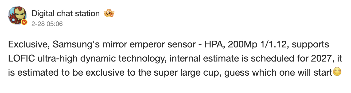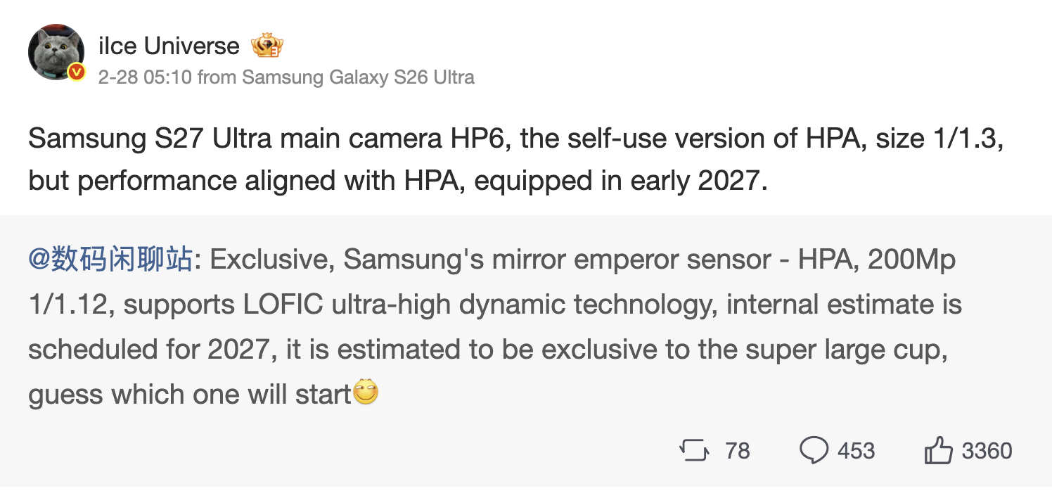No entanto, a Digital Chat Station e a Ice Universe discordam sobre o tamanho do sensor da ISOCELL HPA. No momento, os dois relatam tamanhos de sensor de 1/1,12 polegada e 1/1,3 polegada, respectivamente. Além disso, o Ice Universe acredita que a Samsung também anunciará o ISOCELL HPA como o ISOCELL HP6 no Galaxy S27 Ultra. Nesse estágio, não esperamos que os detalhes do hardware da câmera sejam confirmados até o final de 2026.