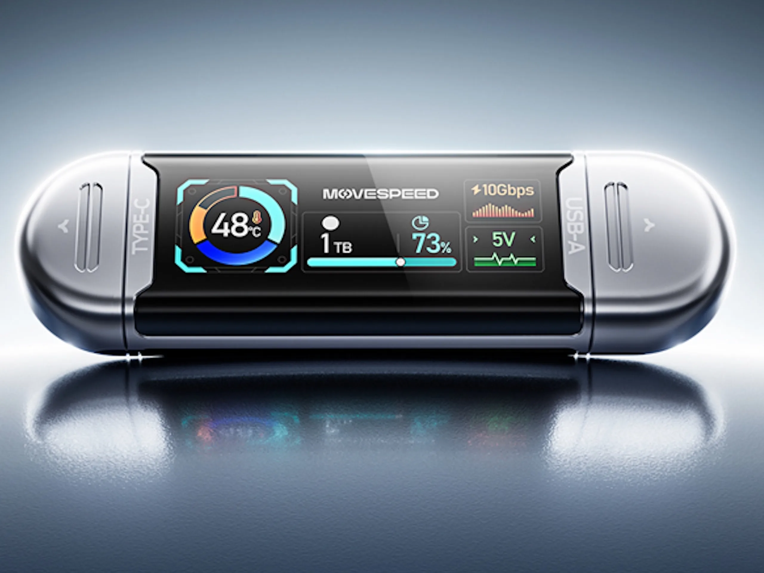 O See U USB Drive da Movespeed, também conhecido como SU10, está disponível com cinco níveis de armazenamento: 128 GB, 256 GB, 512 GB, 1 TB e 2 TB. Cada versão apresenta portas USB-C e USB-A 3.2 Gen 2.1, com tampas protetoras e uma tela central. Na tela TFT de 1,65 polegadas (~42 mm), os usuários podem visualizar vários pontos de dados, incluindo a temperatura atual, a capacidade e a taxa de transferência de dados. De acordo com a página da campanha, a tela tem um brilho médio de 350 nits e um ângulo de visão de 170°.