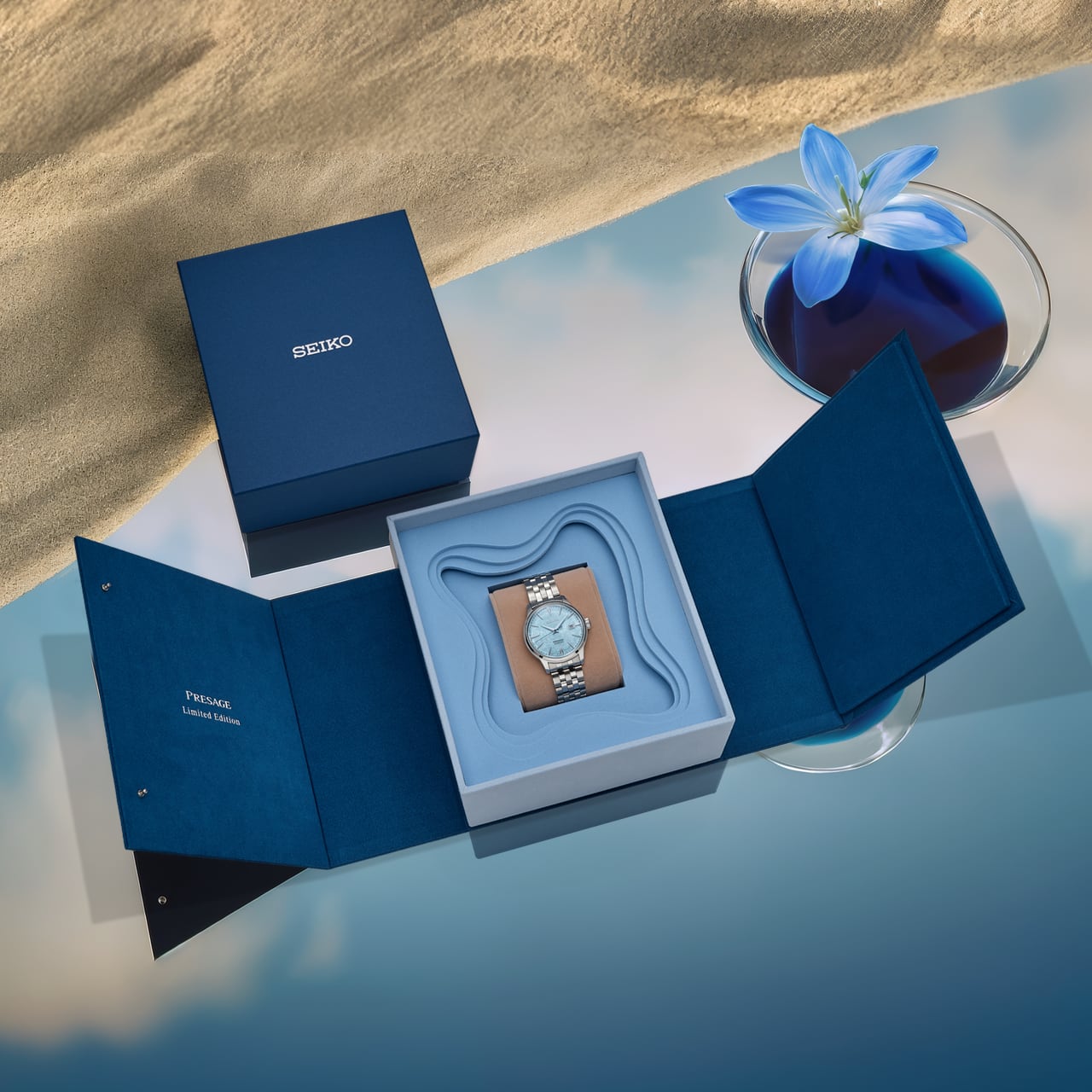 O Presage Cocktail Time Maya Bay Limited Edition tem uma caixa de aço inoxidável prateado, com 40,5 mm de diâmetro e 11,8 mm de profundidade. Ela envolve um mostrador azul claro com um efeito cintilante, imitando as águas de Maya Bay. O relógio vem com uma pulseira de aço inoxidável combinando, presa com um fecho de segurança.