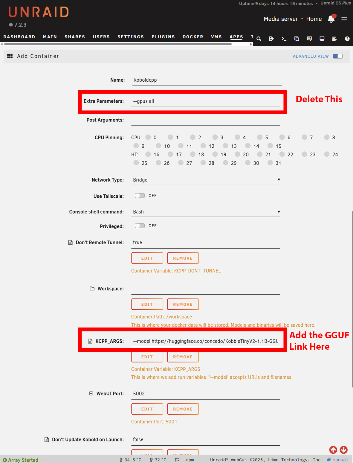 A instalação no Windows é praticamente a mesma. No entanto, o senhor precisará fazer o download da versão NoCUDA se estiver usando sem uma GPU. Pode demorar um pouco para iniciar, pois o KoboldCPP fará o download do modelo antes de apresentar a interface ao senhor. No Windows, isso é óbvio, mas no Unraid ou no TrueNAS, o senhor terá de abrir os registros para ver o progresso do download. No Unraid, talvez o senhor precise aumentar o armazenamento disponível dos contêineres do Docker o armazenamento disponível dos contêineres do Docker, dependendo do tamanho do modelo escolhido.