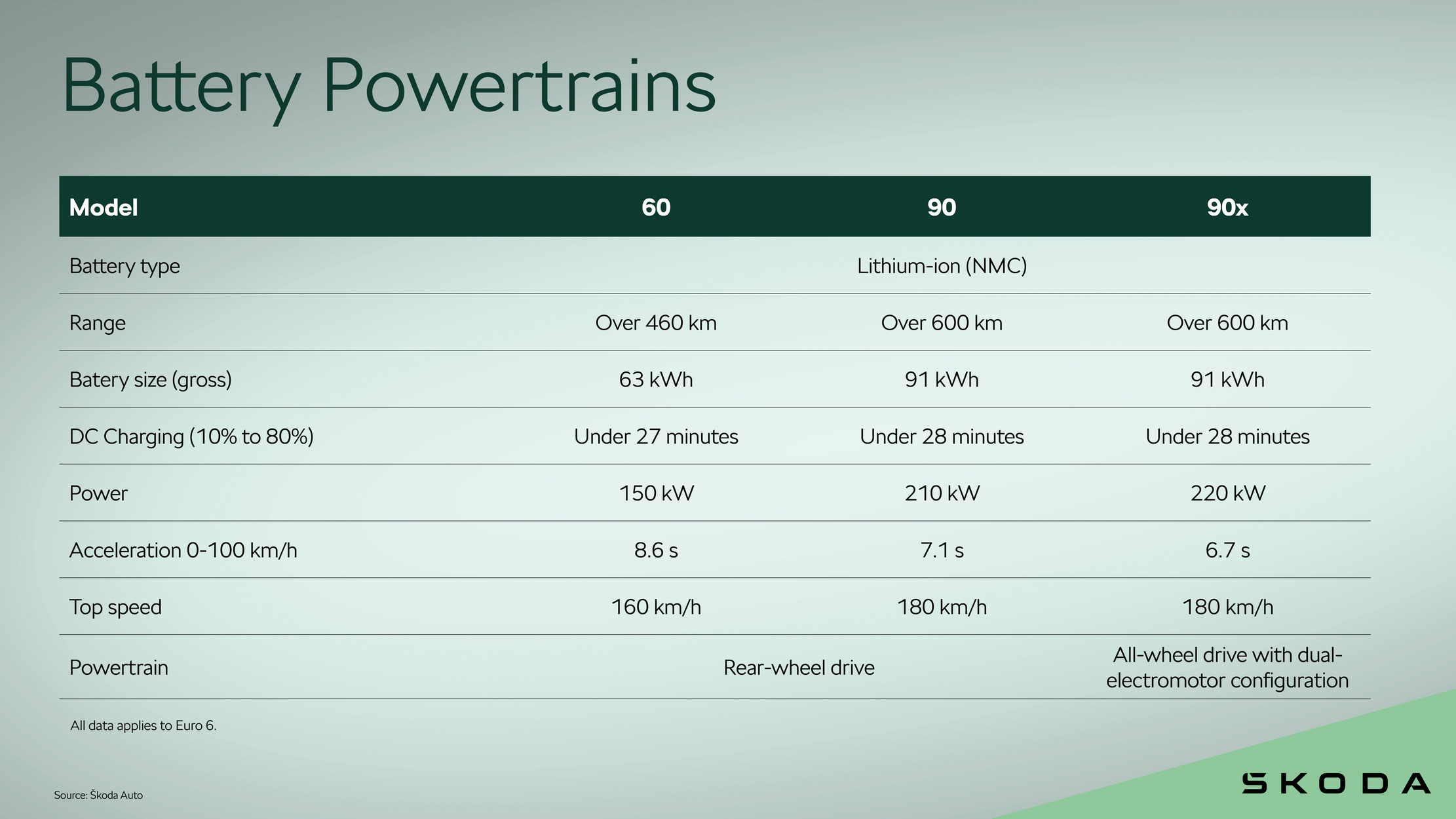 Os modelos grandes 90 e 90x superam isso com sua potente bateria de 91 kWh, permitindo alcances de mais de 600 quilômetros. O modelo 90 tem 210 kW de potência e tração traseira, enquanto o 90x topo de linha tem 220 kW de potência e tração integral com dois motores elétricos. Todas as variantes de bateria podem ser carregadas de 10 a 80% em menos de 28 minutos em um carregador rápido.