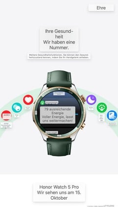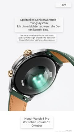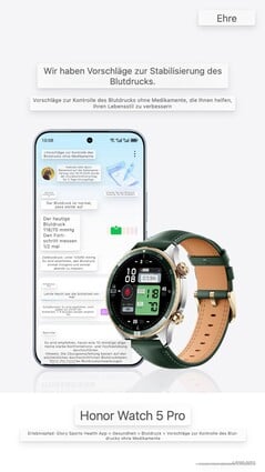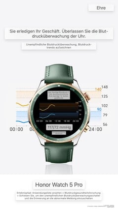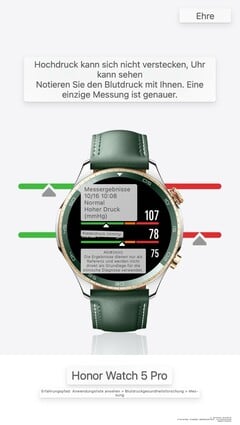 Novas imagens teaser do site Honor mostram que o smartwatch fornece medições específicas, incluindo uma avaliação se a pressão arterial está muito alta ou muito baixa. O aplicativo para smartphone correspondente oferece dicas sobre como aumentar ou diminuir a pressão arterial. No entanto, o Honor provavelmente usa um sensor PPG óptico para determinar a pressão arterial, semelhante ao da Samsung, portanto, os usuários devem tratar essas medições como valores aproximados.