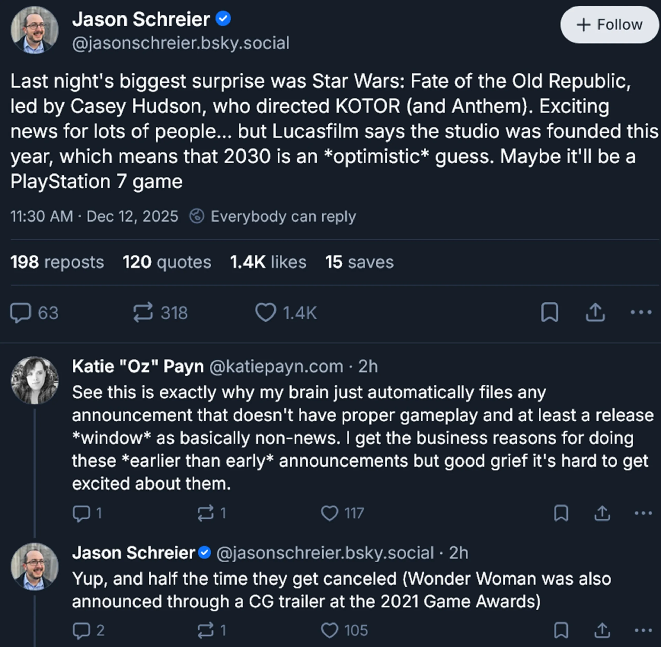 Jason Schreier foi ao Bluesky para comentar sobre o novo jogo de Star Wars. Embora a notícia tenha sido bem recebida, sua postagem pode diminuir um pouco o entusiasmo. A Arcanaut Studios uniu forças com a Lucasfilm Games apenas este ano para iniciar o projeto. Casey Hudson, que ajudou a criar o KOTOR original, está retornando como diretor do jogo. Apesar de sua experiência, Schreier acha que "2030 é uma estimativa otimista" para o tempo de chegada.