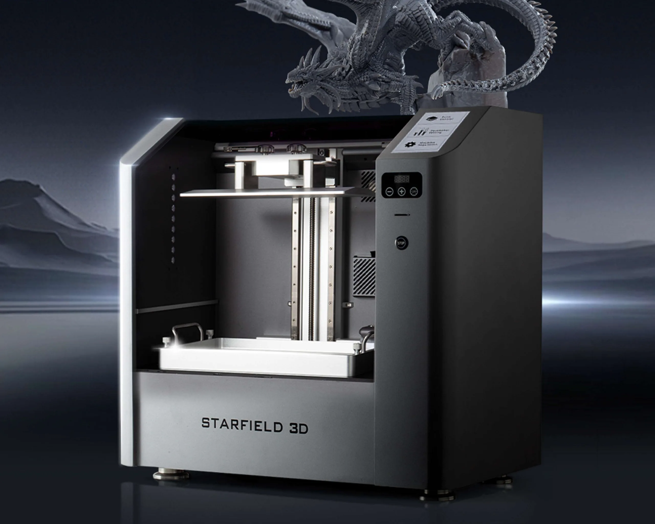 A Starfield 3D é uma nova impressora 3D com uma ampla variedade de recursos. Basicamente, ela é uma impressora SLA que realiza trabalhos de impressão 3D por meio da cura seletiva de uma resina fotossensível. A Starfield 3D não usa uma tela LCD, mas sim um laser. O sistema de 720 x 450 x 700 milímetros pesa robustos 58 quilos. A resolução anunciada é de 25 µm e a espessura da camada está entre 0,025 e 0,15 milímetros. Podem ser produzidas impressões de até 350 x 350 x 240 milímetros.