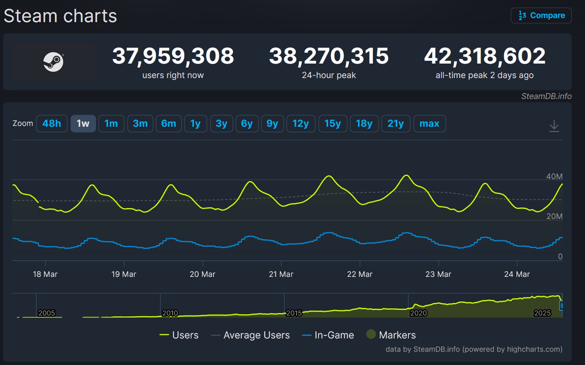 Parece que todo mês a Valve estabelece um novo recorde para confirmar seu domínio. A mais recente conquista do mercado foi superar seu pico anterior de usuários simultâneos de mais de 42 milhões em janeiro. Com a recente data de lançamento de Data de lançamento do Crimson Desert como fator, esse número subiu para 42,3 milhões em 22 de março.