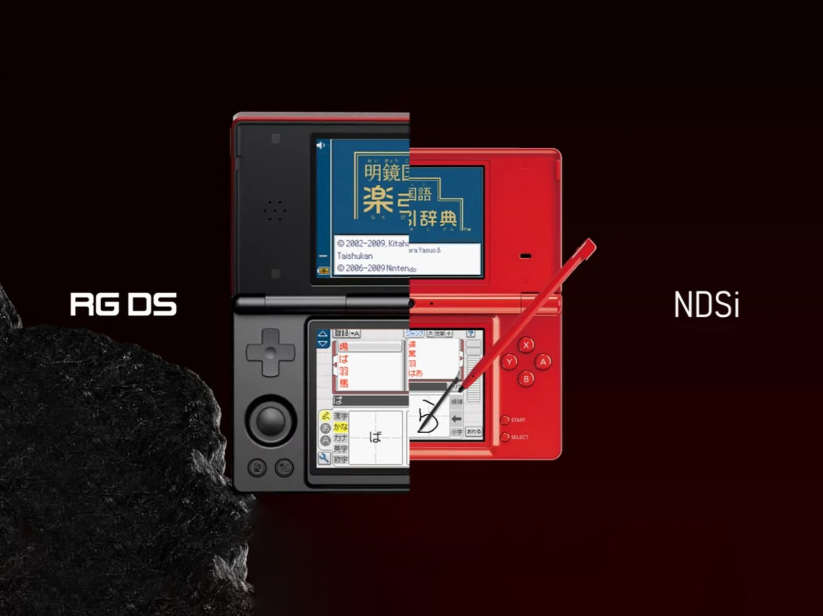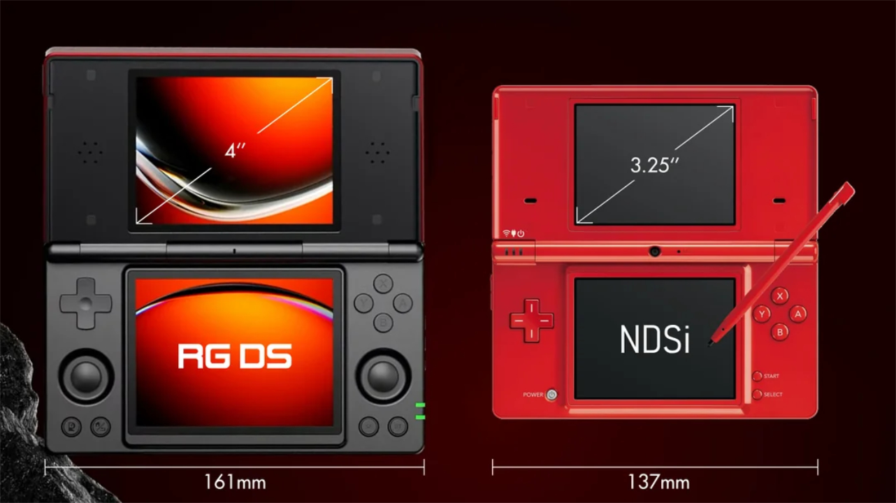 Abaixo, os teasers se concentram no tamanho do RG DS e em como ele se compara aos portáteis anteriores do Nintendo DS. Oficialmente, a Anbernic só confirmou a largura do RG DS até o momento, que é de 161 mm. Como resultado, o RG DS é muito mais largo que o Nintendo DSi, que tem apenas 137 mm de largura.