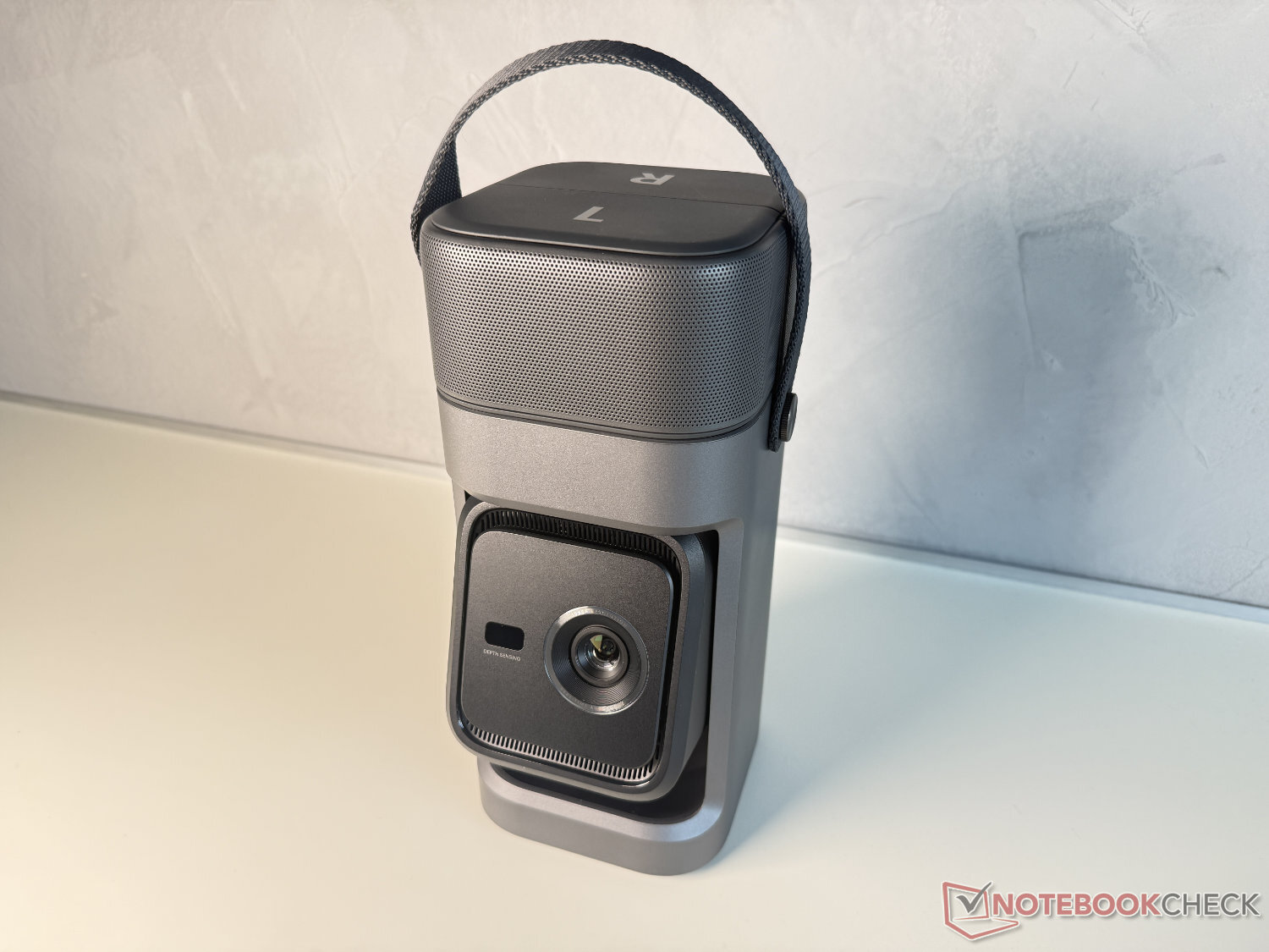 A unidade de projeção é girada no modo de transporte e, portanto, protegida. Antes do uso, ela é girada para fora do dispositivo, que também funciona como um gimbal de 130 graus e permite um alinhamento flexível. A imagem é reproduzida por um pequeno sensor DLP com fonte de luz LED, o que, de acordo com o fabricante, resulta em uma imagem Full HD brilhante de 650 ANSI lúmens (1.920 x 1.080 pixels).