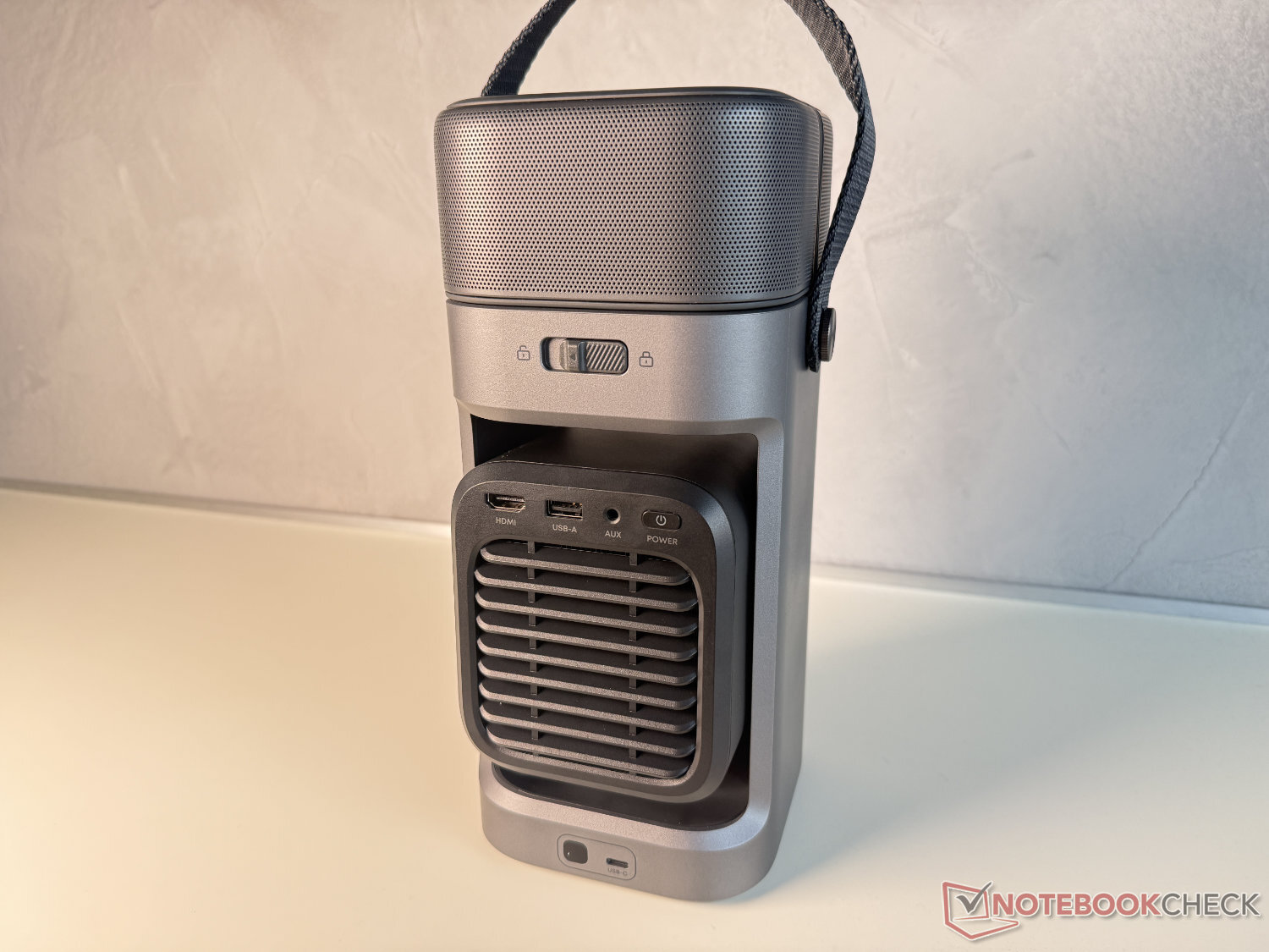 Assim como os modelos mais caros X1 e X1 Pro a anker Soundcore também dispensou a integração de uma bateria no P1. Isso é uma pena para um conceito móvel como esse, mas, em última análise, teria levado a dimensões maiores, um peso maior e um preço mais caro. O Nebula P1 pesa menos de 2,4 kg, incluindo os alto-falantes, e mede aproximadamente 28 x 13 x 13 cm (incluindo os alto-falantes), facilitando o transporte, o que também é auxiliado pela alça de transporte flexível.