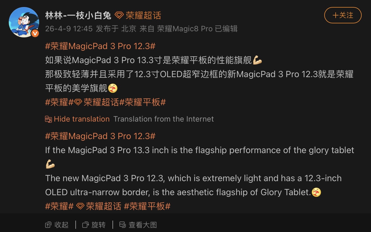 A publicação no Weibo também revelou que o tablet OLED MagicPad 3 Pro de 12,3 polegadas pesará apenas 440 gramas, ou cerca de 14,11 onças. O design geral do tablet parece ser idêntico ao da variante equipada com IPS, com câmeras duplas na parte traseira e molduras ultrafinas na parte frontal. Outros detalhes sobre o tablet ainda não foram revelados, e o mesmo vale para o preço e a disponibilidade.