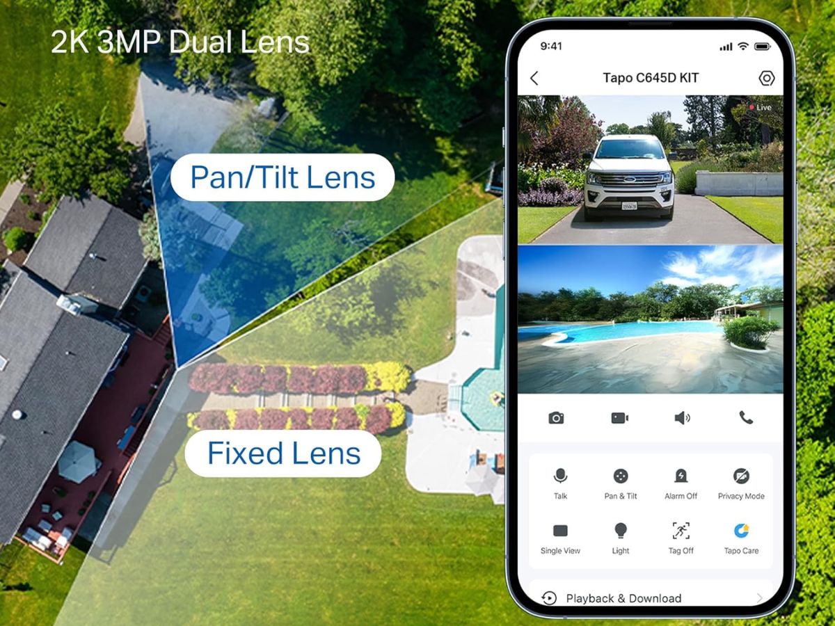 A C645D da Tapo tem uma lente 2K fixa superior com um campo de visão (FOV) de 165° e uma lente telefoto 2K inferior com pan/tilt, que pode rastrear automaticamente objetos em movimento em até 360° na horizontal e 120° na vertical. A câmera de segurança inteligente pode identificar pessoas, veículos e animais de estimação, um recurso que não requer assinatura. Outras funções incluem visão noturna colorida e zonas de atividade ou privacidade personalizáveis.