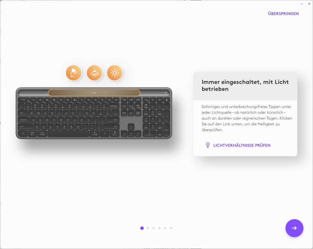 Além do próprio teclado, a embalagem inclui um breve manual do usuário. A embalagem é minimalista e consiste em grande parte de material reciclado, o que está de acordo com o compromisso da Logitech com a sustentabilidade. A tecnologia solar é particularmente digna de nota: O teclado tem uma célula solar integrada que pode ser carregada por luz natural e artificial (pelo menos 200 lux). Isso significa que uma fonte de energia externa geralmente é desnecessária, reduzindo ainda mais o impacto ambiental. De acordo com o fabricante, apenas uma hora de luz solar é suficiente para alimentar o teclado por várias semanas.