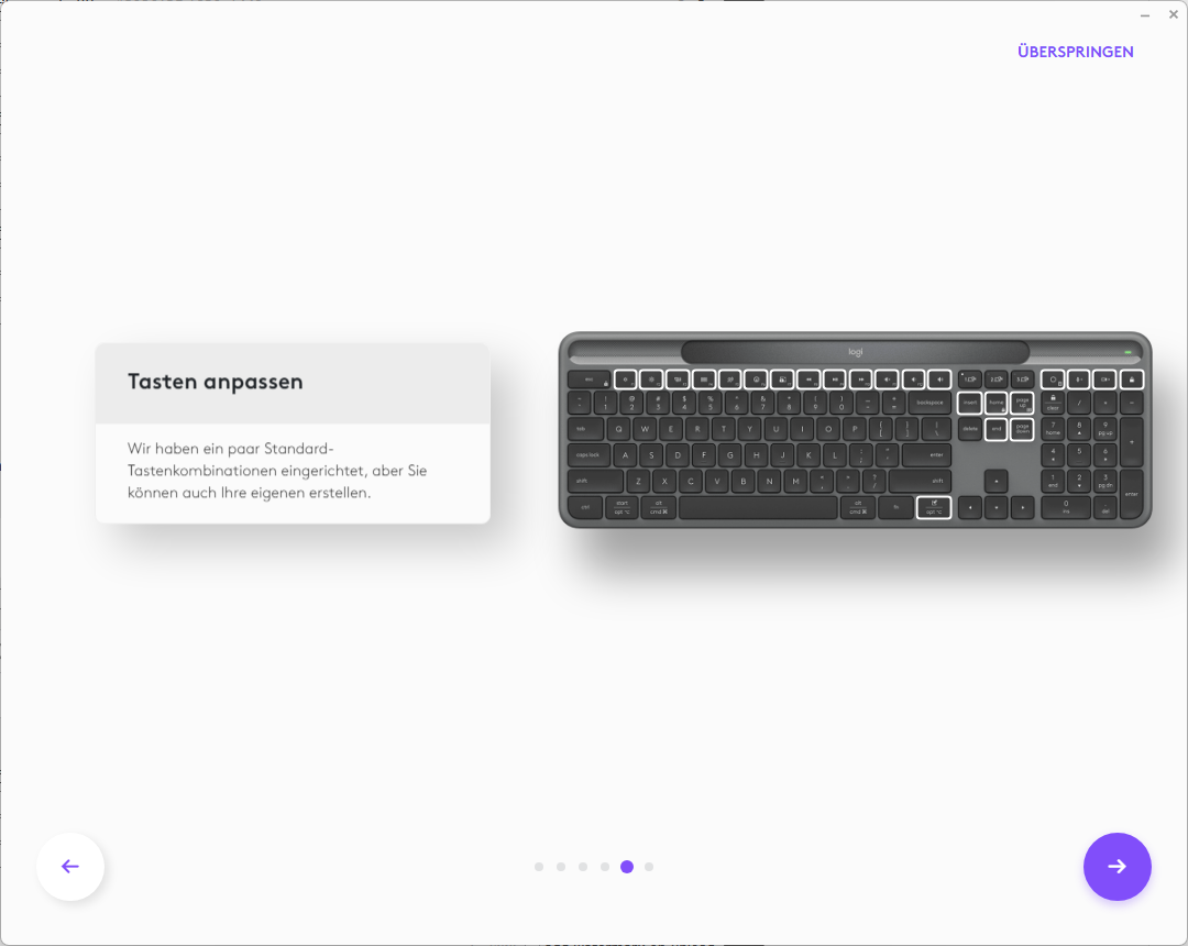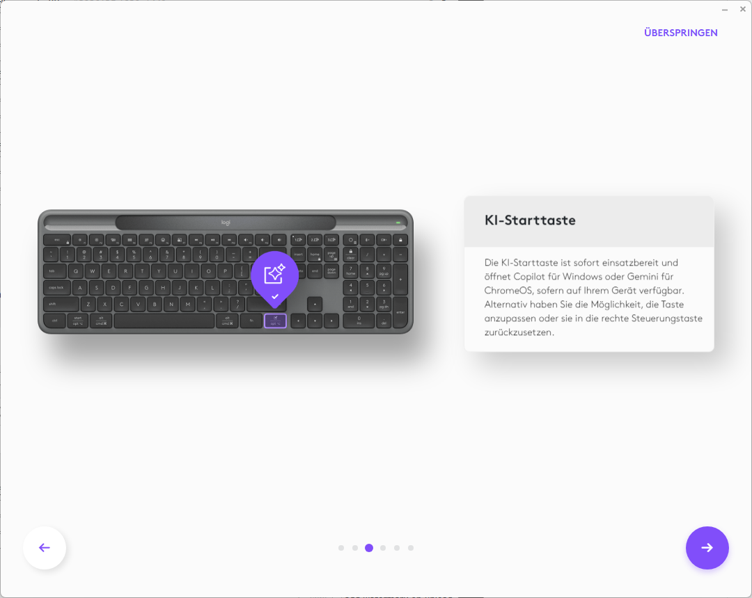 O layout das teclas é padrão e, portanto, imediatamente familiar para a maioria dos usuários, mas a Logitech acrescentou uma tecla AI adicional e teclas de controle adicionais para reuniões on-line. Muitas das teclas também podem ser personalizadas ou atribuídas a Smart Actions.