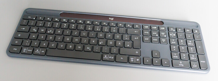 O Logitech Signature Slim Solar+ é um teclado com design moderno e minimalista que se destaca graças às suas dimensões finas e ao peso relativamente baixo. Ele tem apenas cerca de 20 mm de altura e pesa 700 gramas. A carcaça é feita principalmente de plástico reciclado, o que não só contribui para a sustentabilidade, mas também lhe confere um acabamento agradável e fosco. As teclas são planas e oferecem uma experiência de digitação agradável e razoavelmente silenciosa, adequada para ambientes de escritório. No entanto, ele não é de forma alguma silencioso, como a Logitech afirma em seu site. No momento, o teclado só está disponível em grafite.