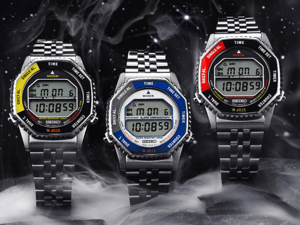 A Coleção 1 do Projeto Power Design da Seiko ressuscita o peculiar Tissé de 1984 com pulseiras de elos de contas e movimento de quartzo 4N30 (AUD 575-650), disponível em prata, preto ou dourado. Os fãs do estilo retrô também têm o Reedição do Rotocall (novembro de 2025, estimado em US$ 470), o NASA digital dos anos 1980 com três opções de bezel colorido e 100m WR.