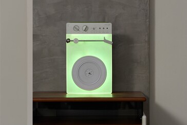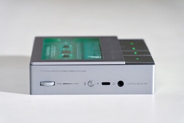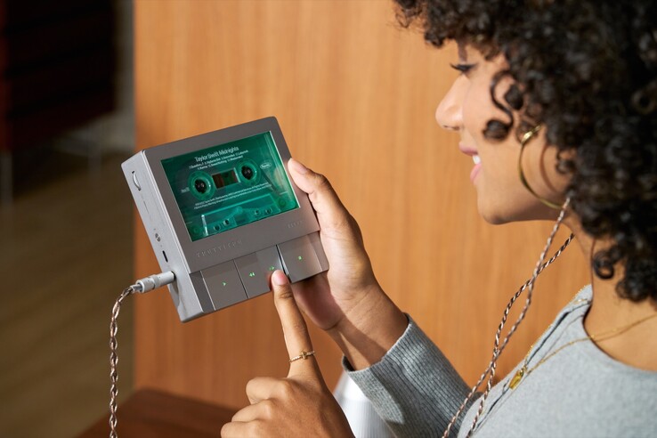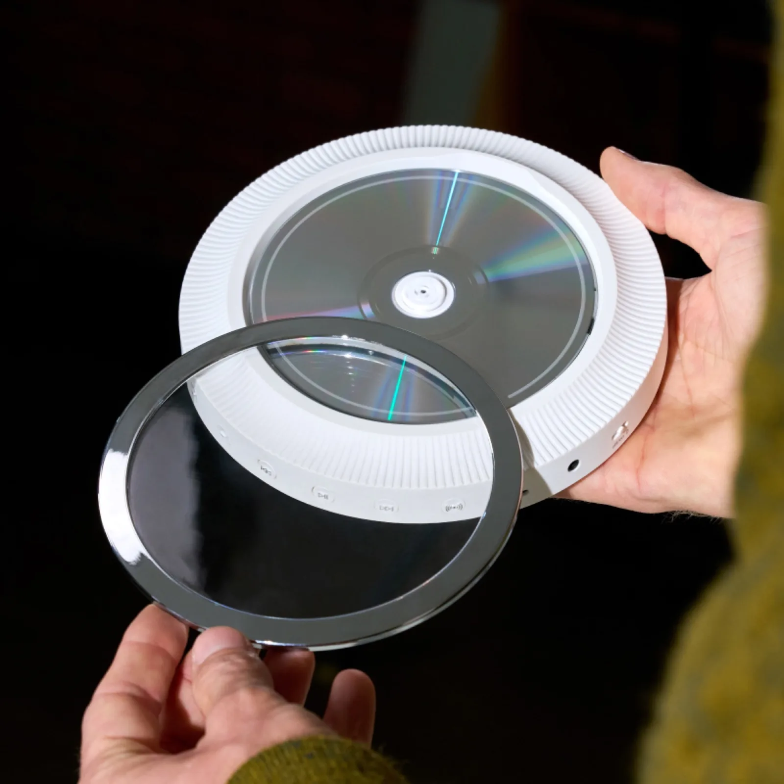 O CD player compacto também tem uma bateria, e a frente redonda pode ser virada para o lado para trocar o CD. Um pequeno visor OLED mostra detalhes sobre a reprodução e a bateria. Assim como o toca-fitas, o CD player é carregado via USB-C, todos os componentes têm uma carcaça de metal de alta qualidade e oferecem Bluetooth e AUX