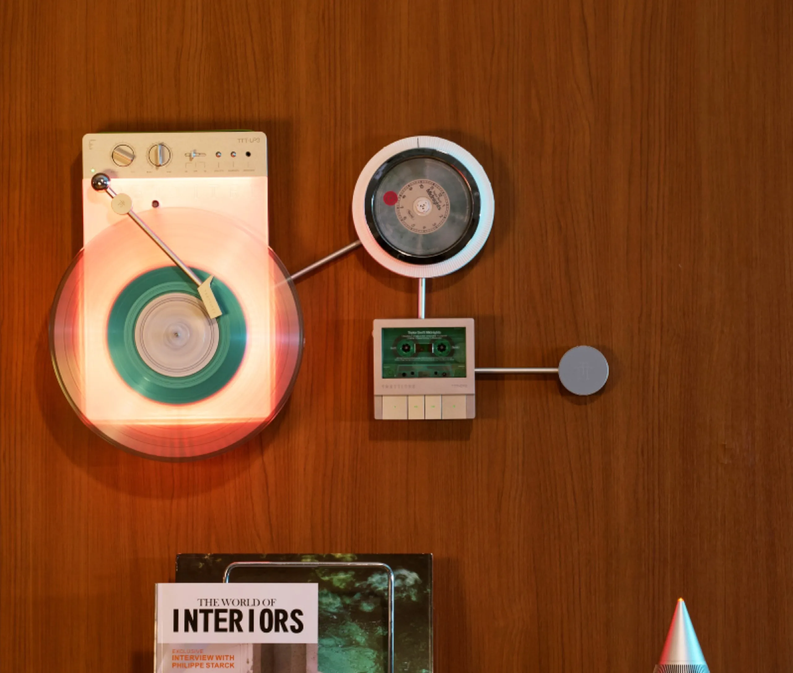 Esse suporte de parede também pode prender magneticamente um smartphone, como o Apple iPhone 17. O sistema também é composto por três dispositivos de reprodução que podem reproduzir discos, CDs e fitas cassete compactas. O toca-discos é o destaque do design, pois apresenta uma superfície iluminada que exibe habilmente o vinil
