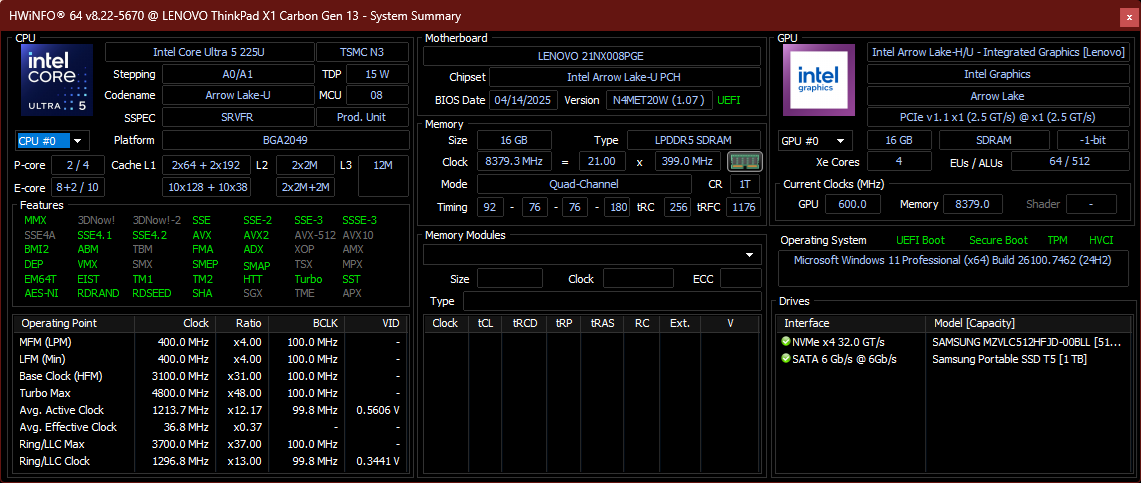 | Lenovo ThinkPad X1 Carbon Gen 13 21NX008PGE Intel Core Ultra 5 225U ⎘ Intel Graphics 4-Core iGPU (Arrow Lake) ⎘ 16 GB Memória, 512 GB SSD | Amazon: $1,649.99 Preço de tabela: 1955 Euro | 1.2 kg | 17.5 mm | 14.00" 1920x1200 162 PPI IPS LED | |