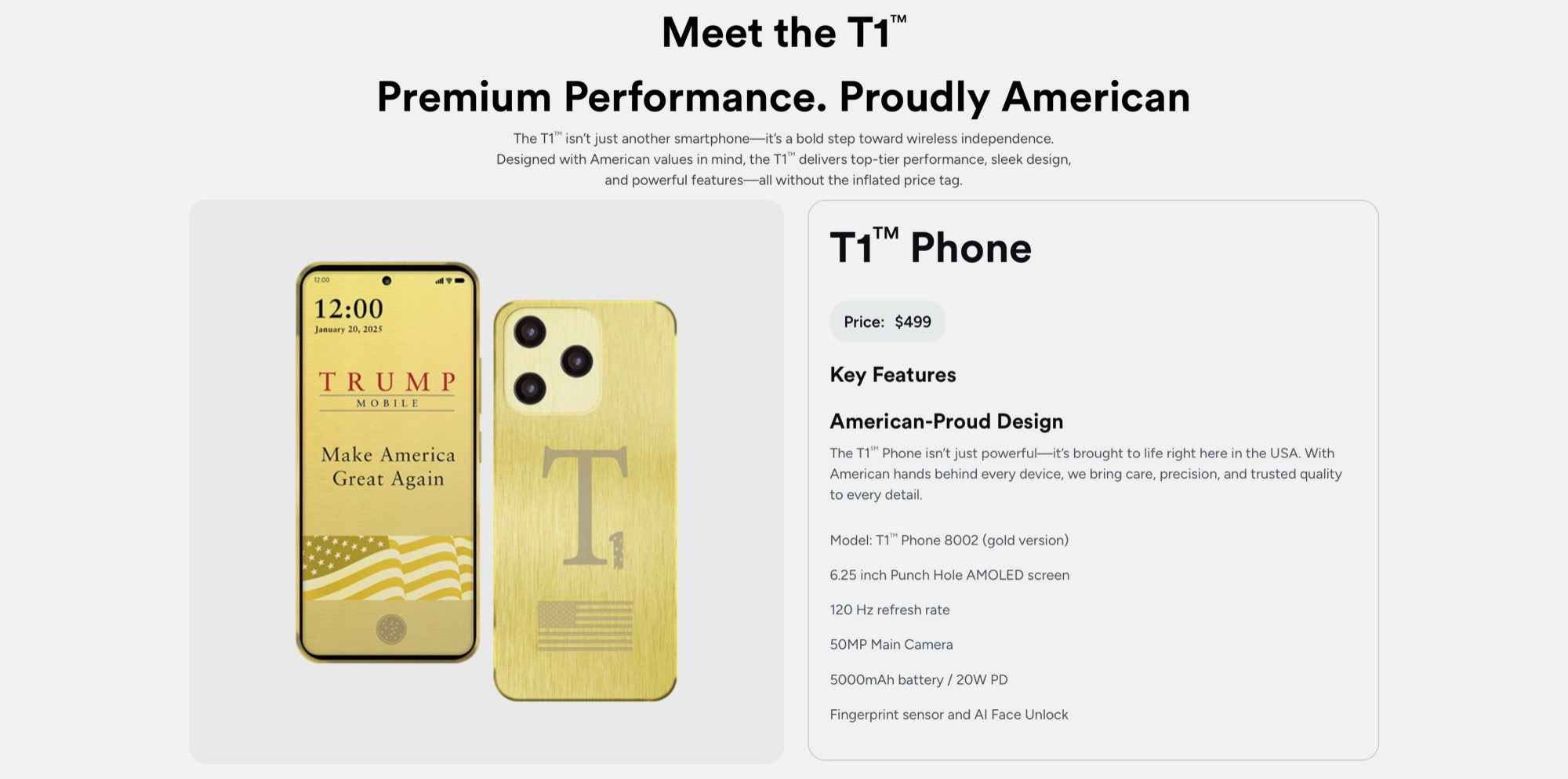 O Trump T1 Phone foi apresentado em meados de junho de 2025. Com preço de US$ 499, o smartphone de médio porte oferece especificações mais alinhadas com dispositivos de nível básico muito mais baratos. As pré-encomendas começaram logo após o anúncio, exigindo que os primeiros compradores pagassem um depósito de US$ 100. Apenas duas semanas após seu lançamento, a Trump Mobile já havia alterado suas especificações e confirmou que ele não era "Made in USA", como anunciado originalmente.