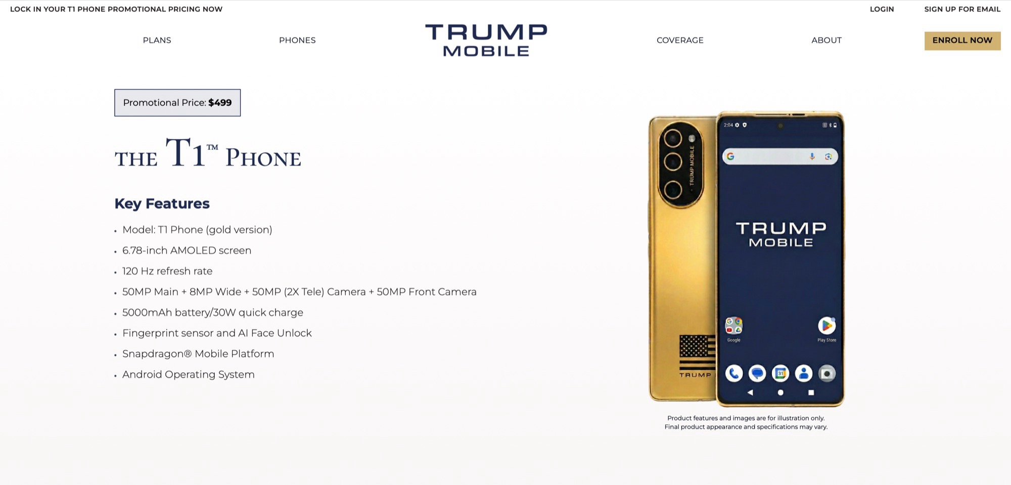 Ao contrário do que foi anunciado originalmente, o Trump T1 Phone não é fabricado nos EUA e o design foi trocado por uma versão dourada do Samsung Galaxy S26 Ultra(US$ 1.299 na Amazon) ou do iPhone 16 Pro, uma data de entrega ainda não foi confirmada quase um ano depois, e até mesmo as especificações foram alteradas várias vezes. Em fevereiro, a Trump Mobile finalmente revelou o design supostamente final. Agora, uma versão personalizada desse design é mostrada na página oficial do produto juntamente com especificações que foram alteradas novamente