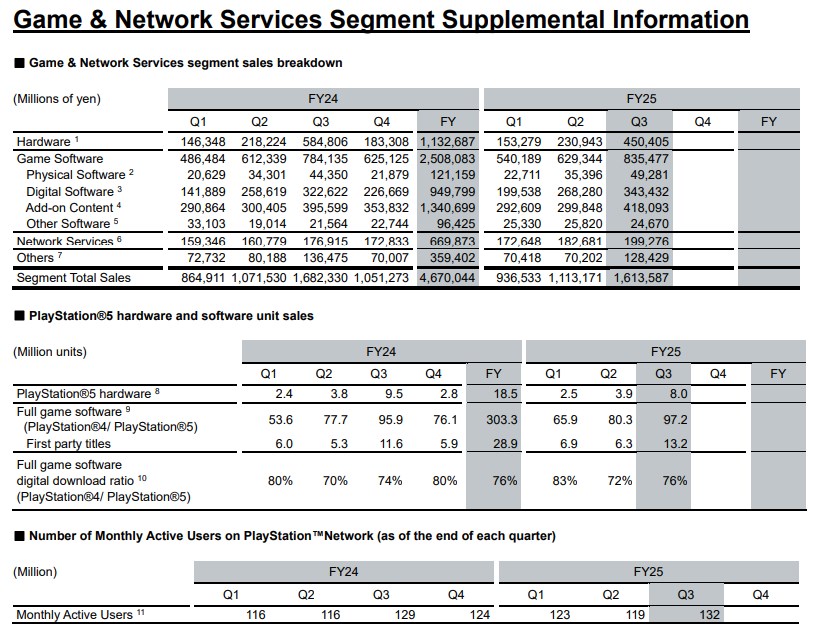 A empresa também relatou 132 milhões de usuários ativos mensais na PlayStation Network em 31 de dezembro de 2025. Esse número aumentou em três milhões em comparação com o mesmo período do ano fiscal anterior.