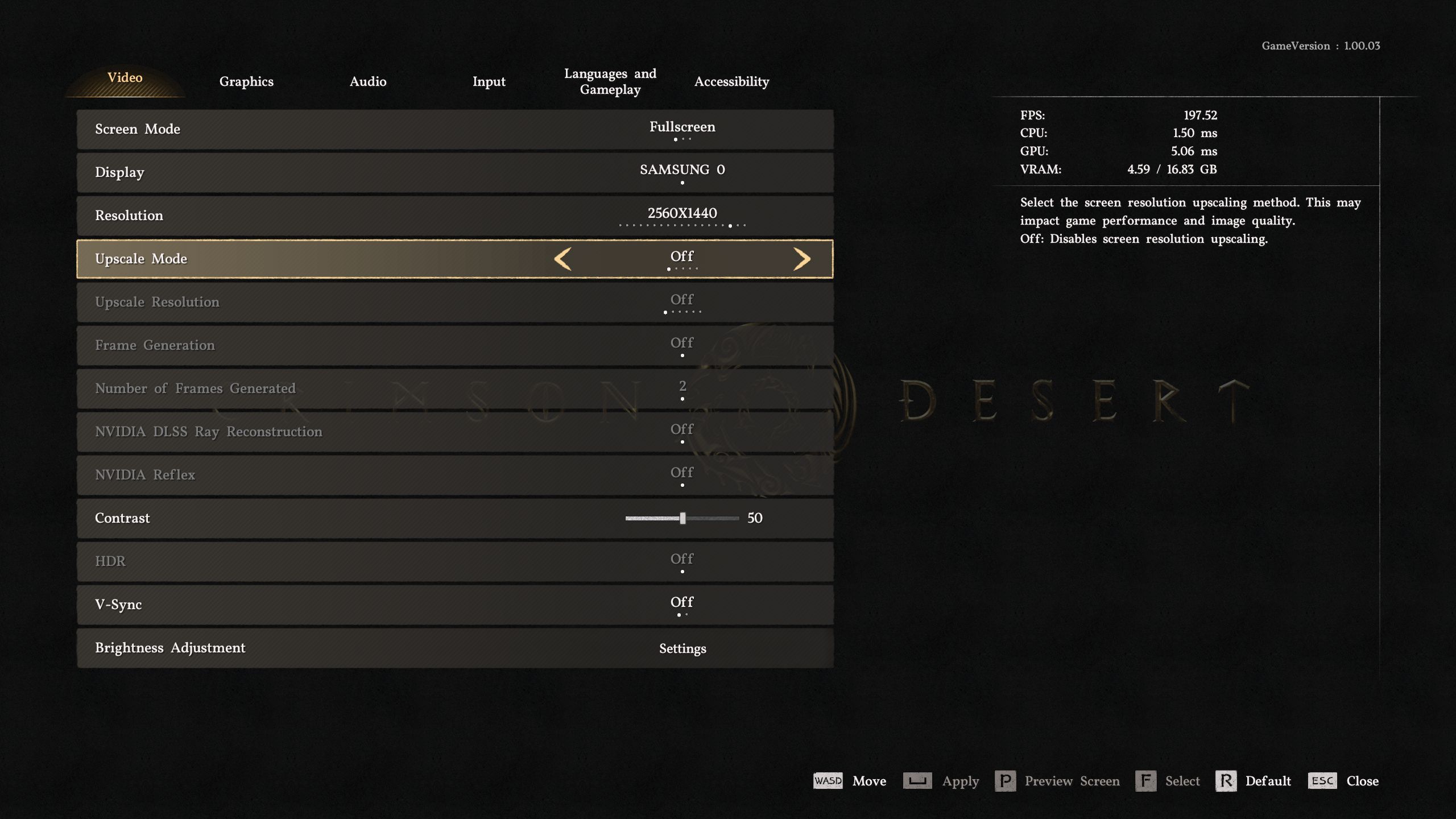 O jogo também merece crédito por seu extenso menu de gráficos, que é dividido em duas guias. As opções de vídeo permitem que o usuário altere não apenas a resolução, mas também o upscaling, entre outras configurações. Embora o Crimson Desert não ofereça suporte ao XeSS, ele inclui o FSR 3.1, bem como o DLSS 4.0 e o DLSS 4.5. Como esperado de um jogo atual, o título também oferece suporte à geração de quadros. A Reconstrução de Raios também pode ser ativada, se desejado, resultando em uma iluminação ainda mais atraente e crível (veja as capturas de tela abaixo).