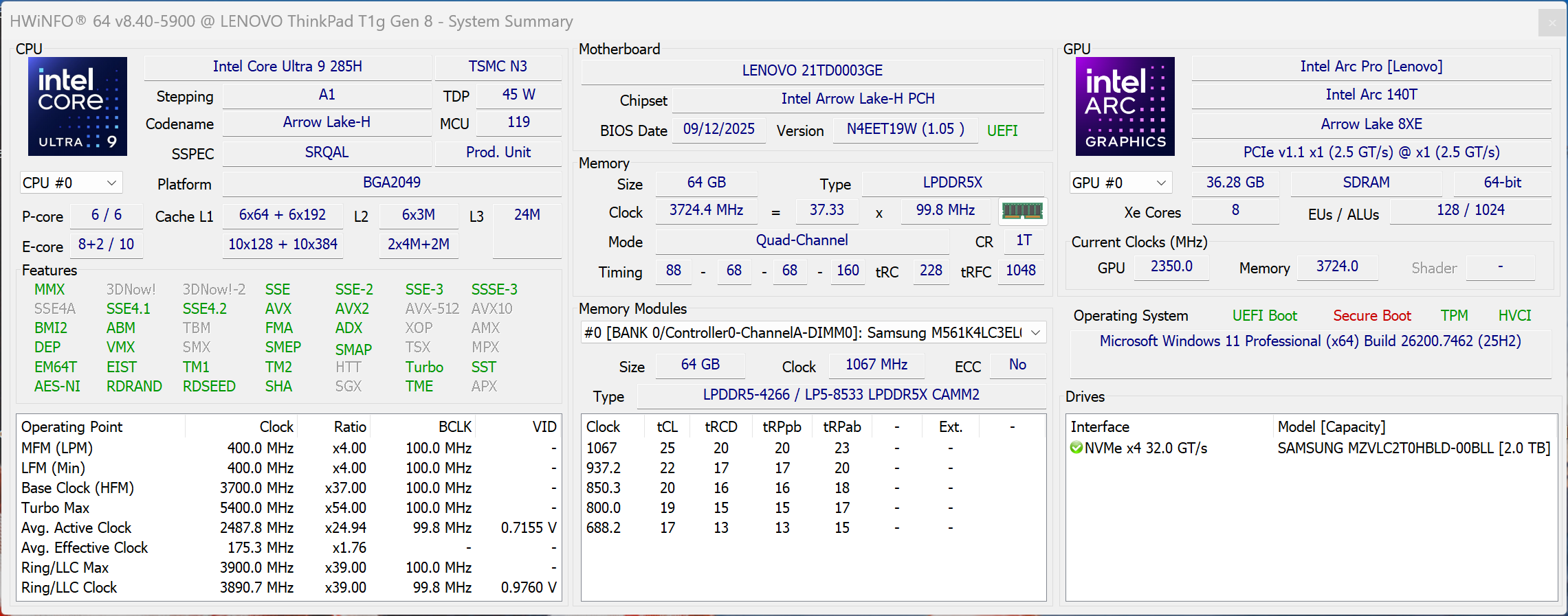 | Lenovo ThinkPad T1g Gen 8 21TD003GE Intel Core Ultra 9 285H ⎘ NVIDIA GeForce RTX 5070 Laptop ⎘ 64 GB Memória, 2048 GB SSD | Amazon: 1. $3,839.06 Lenovo ThinkPad T1g Gen 8 21... 2. $3,099.99 Lenovo ThinkPad P1 Gen 7 Wor... 3. $5,532.00 Lenovo ThinkPad T1g Gen 8 21... Preço de tabela: 4500€ | 1.9 kg | 15.8 mm | 16.00" 3200x2000 236 PPI Tandem-OLED | |