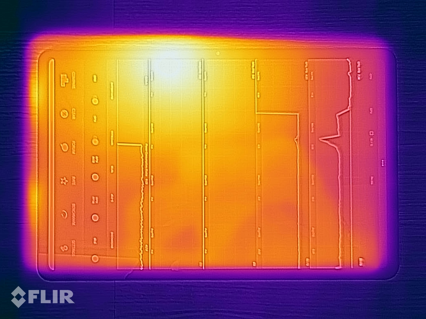 O tablet da Xiaomi permanece frio durante a operação. Em nossos testes, não conseguimos fazer com que ele ultrapassasse uma temperatura de superfície de 38,8 °C. Isso corresponde ao teste de estresse do GFXBench T-Rex, no qual o tablet não apresentou quedas no desempenho, mesmo após uma carga máxima prolongada.