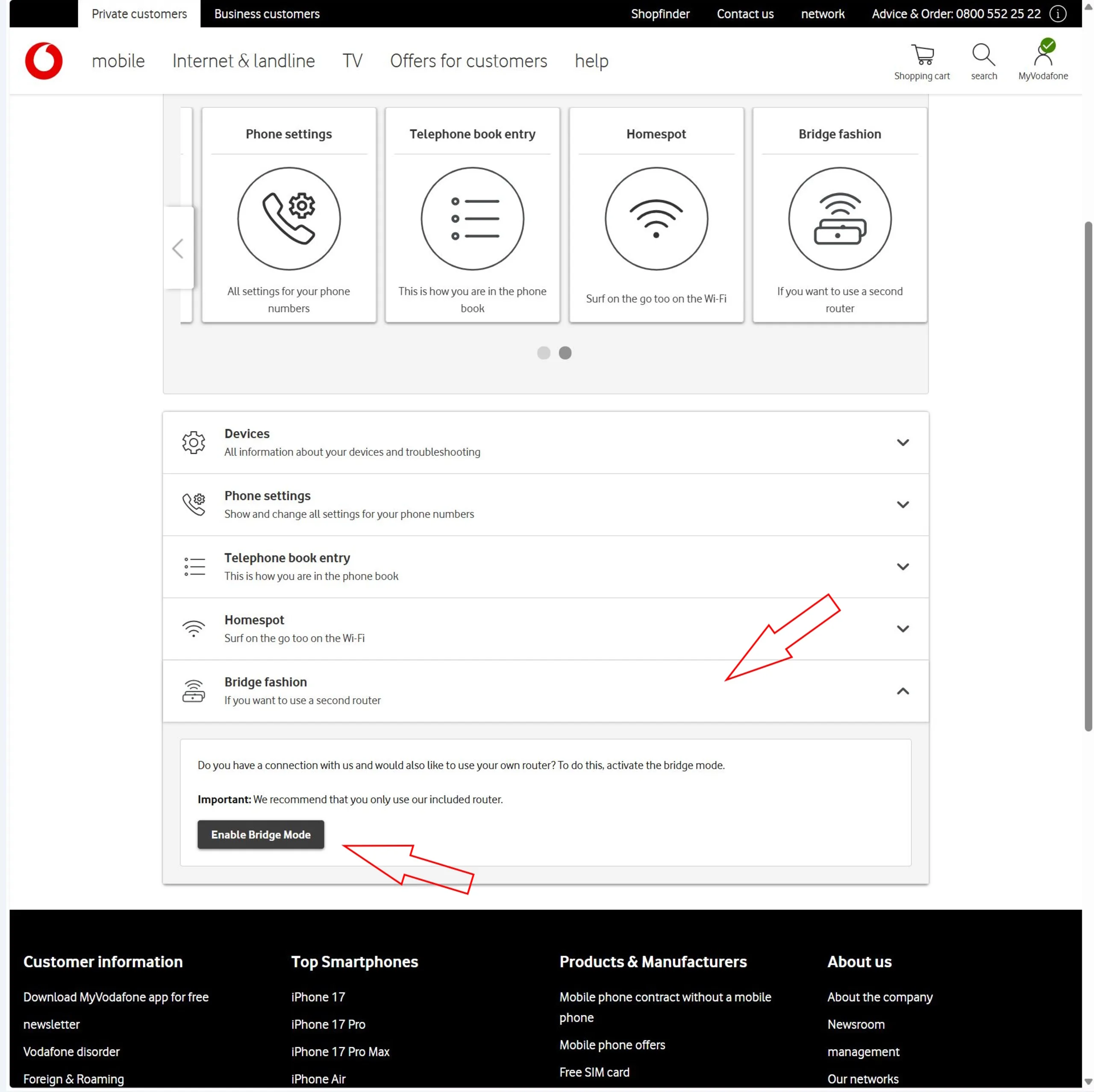 Em muitos casos, no entanto, o modo bridge não pode ser ativado imediatamente porque o Vodafone Homespot está ativo.