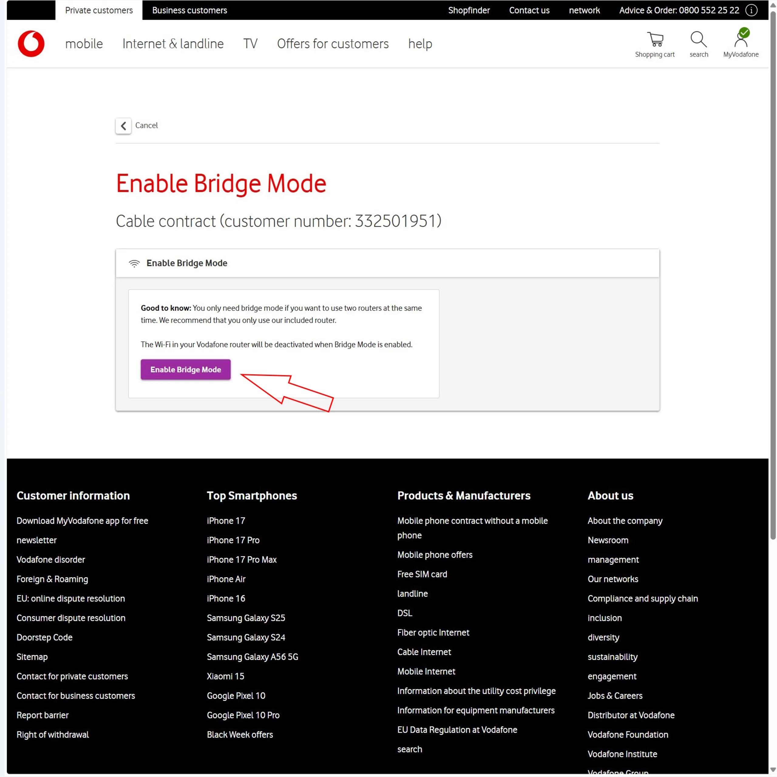 A ativação do modo bridge em si não é tecnicamente complicada, mas não é feita por meio da interface da Web local do roteador. Em vez disso, o senhor precisa fazer login na sua conta on-line da Vodafone.