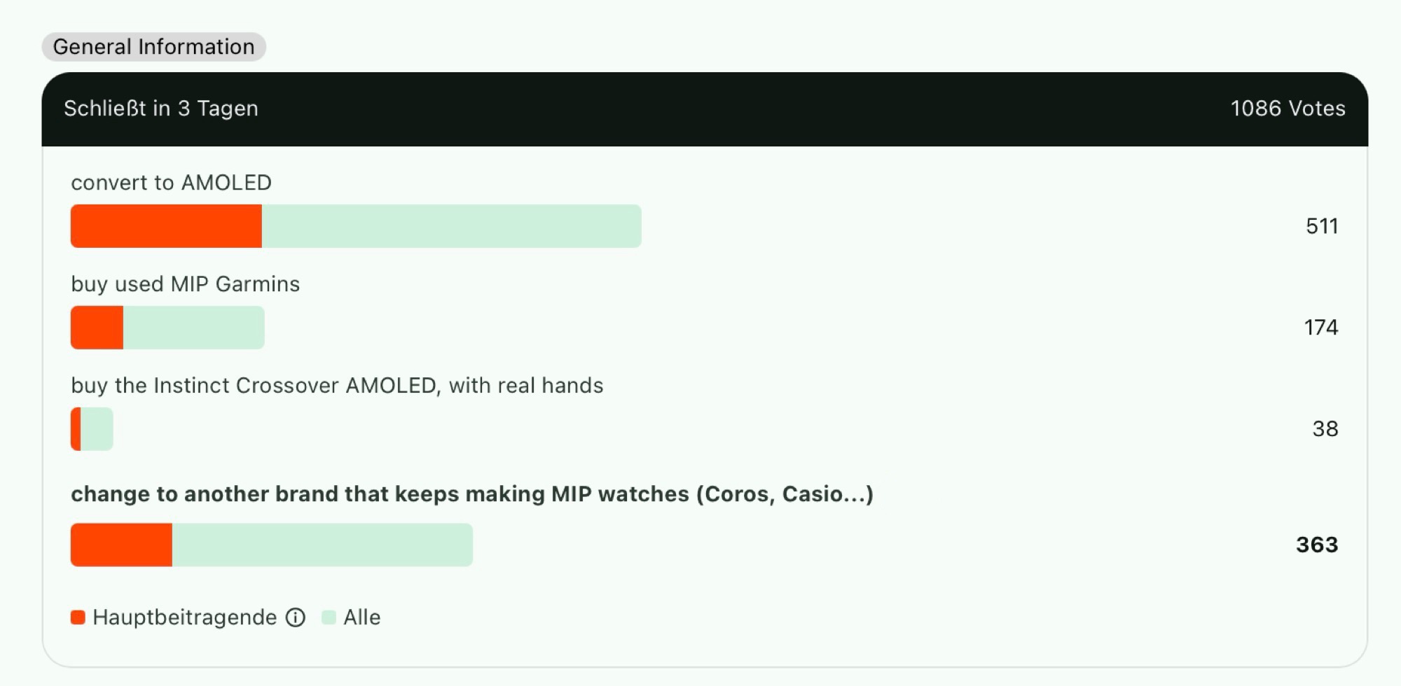 Uma pesquisa no Reddit mostra que, dos 1.086 entrevistados, um total de 537 clientes comprariam um modelo mais antigo com tela MiP ou mudariam para outra marca se a Garmin desistisse da MiP. Apenas 511 clientes considerariam a possibilidade de mudar para um modelo com painel AMOLED. em vez disso, 38 entrevistados optariam pelo Instinct Crossover, que combina um painel AMOLED com ponteiros de relógio