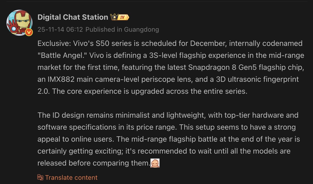 Não está claro se a série S50 também terá dois modelos como seu antecessor. O Tipster Digital Chat Station sugeriu anteriormente que a série apresentará um modelo compacto, provavelmente com a marca S50 Pro Mini. Em um novo vazamento no site https://weibo.com/6048569942/QdLymnukp?pagetype=profilefeedo informante afirma que a série Vivo S50 usará o novo Qualcomm Snapdragon 8 Gen 5 da Qualcomm. Trata-se de um chipset subflagship da Qualcomm, posicionado abaixo do Snapdragon 8 Elite Gen 5. Para referência, o S30 padrão usava o Snapdragon 7 Gen 4 e o S30 Pro Mini usava o Dimensity 9300 Plus.