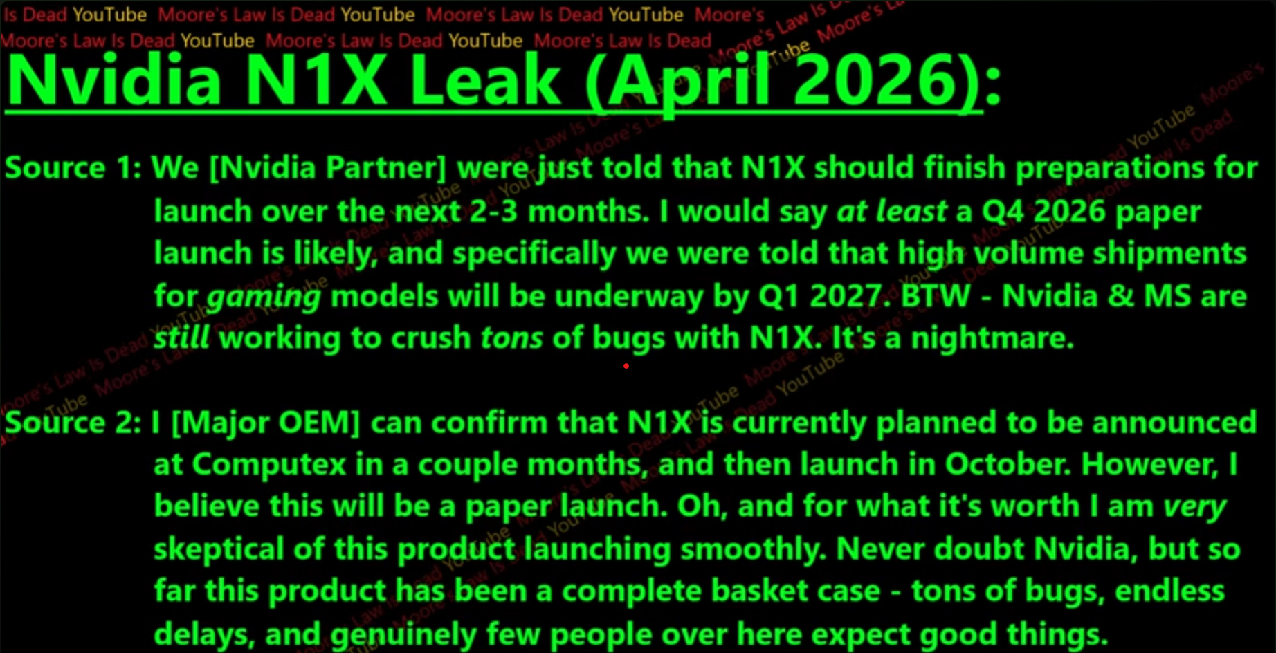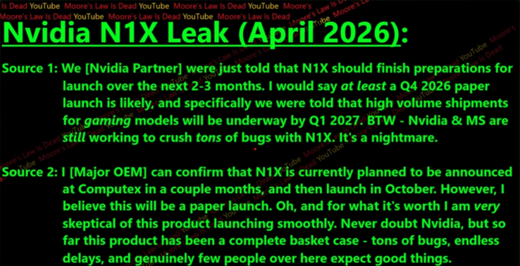 As fontes da cadeia de suprimentos de Tom dizem que a Nvidia planeja exibir o N1X na Computex, que acontecerá entre 2 e 5 de junho deste ano. Os laptops com o hardware serão lançados em outubro, mas a disponibilidade mais ampla não ocorrerá até o início de 2027. Um relatório anterior afirmou que a plataforma N1X estava repleta de bugse, aparentemente, esse ainda é o caso, o que pode ser a causa do atraso. Além disso, a plataforma N1X não se limitará a laptops finos e leves e poderá até mesmo alimentar alguns laptops para jogos da Laptops para jogos da Alienware.