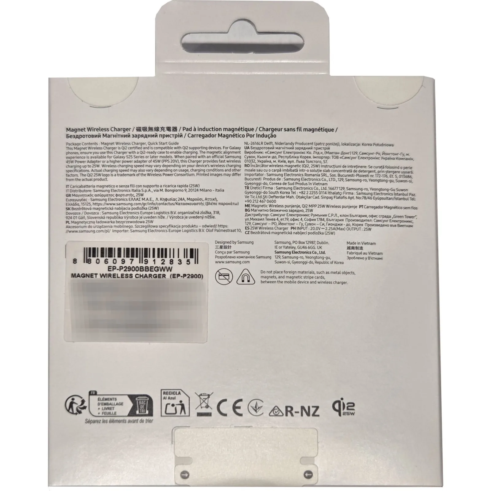 O conector USB-C traz o logotipo "Qi2 25W", e a embalagem também confirma que o carregador é compatível com a versão atual do padrão Qi2. Isso permite que smartphones compatíveis sejam carregados sem fio em até 25 watts. Isso inclui o Apple iPhone 17, enquanto o Galaxy S25 só pode ser carregado com até 15 watts devido a uma limitação do smartphone, não do carregador. O verso da embalagem também informa que o uso com smartphones Samsung Galaxy só é possível se for usada uma capa protetora compatível com Qi2 com ímãs.