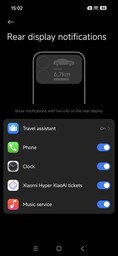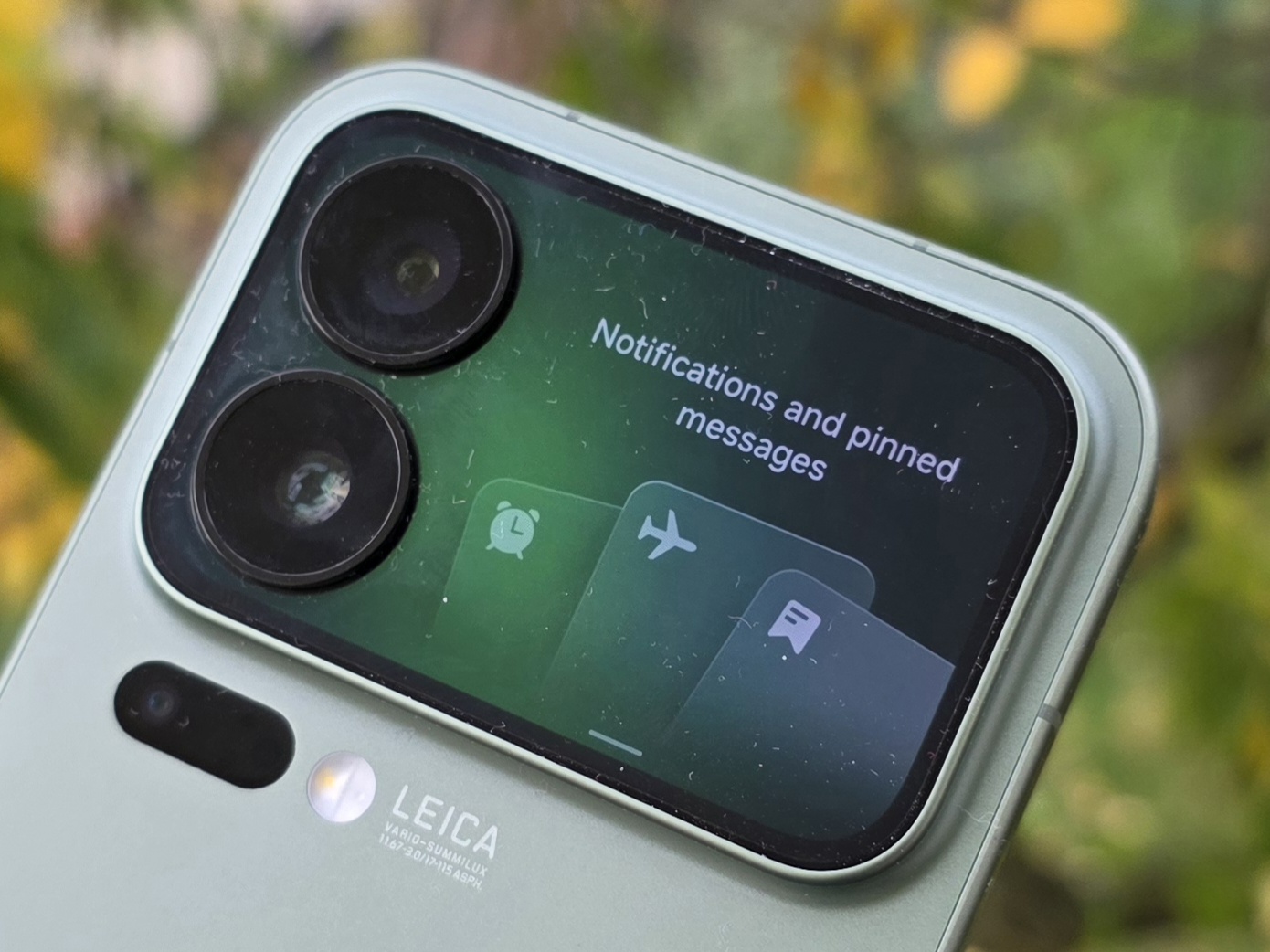 O painel OLED traseiro é muito fácil de ler graças ao seu alto brilho e à nitidez da tela. Além de mostrar a hora e aceitar chamadas, os usuários podem deslizar para baixo para ver mensagens e controlar aplicativos individuais, como o aplicativo de música da Xiaomi. Entretanto, não é possível instalar aplicativos de terceiros aqui, o que limita sua utilidade no dia a dia. O que resta é a capacidade de usar as câmeras Leica na parte traseira para vídeos e selfies.
