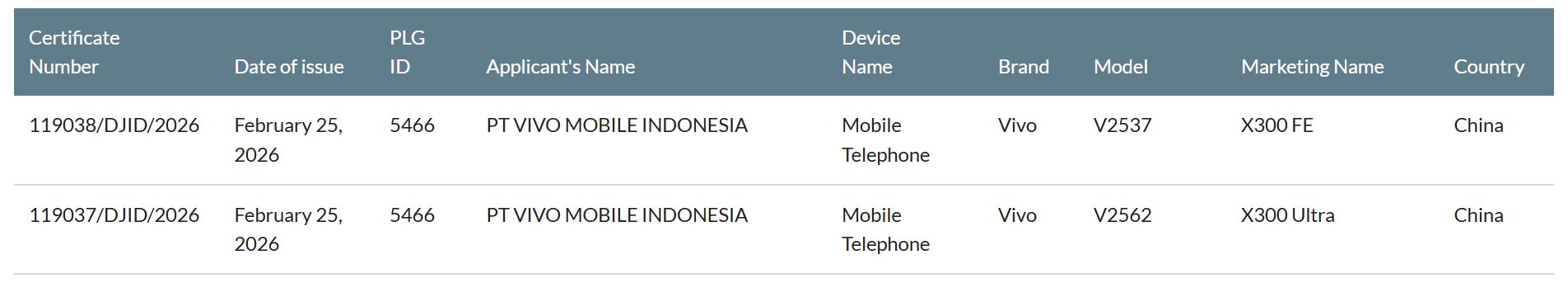 Além do X300 Ultra, o Vivo X300 FE obteve a certificação SDPPI com o número de modelo "V2537" Recentemente, o X300 FE também apareceu no Geekbench com o processador Snapdragon 8 Gen 5. Espera-se que ele seja uma versão rebatizada do Vivo S50 Pro Mini que foi lançado na China.