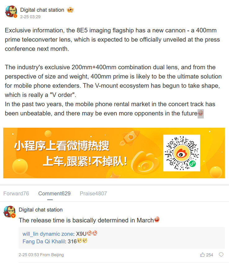 Além disso, o Digital Chat Station sugeriu que a Vivo X300 Ultra também será acompanhada por um novo acessório teleconversor que aceita duas distâncias focais equivalentes. Escrevendo no Weibo, o vazador afirma que o acessório suportará os modos de 200 mm e 400 mm para complementar a teleobjetiva esperada de 85 mm incluída na X300 Ultra.