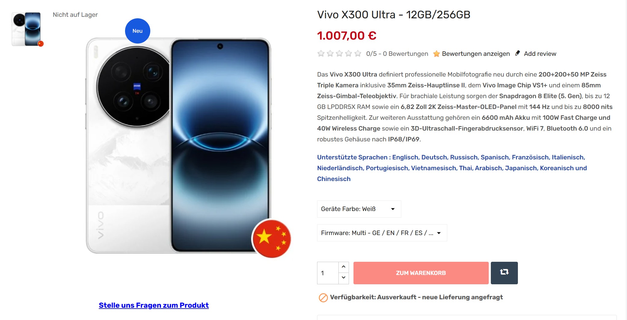 Não, isso não é uma piada de primeiro de abril. Como sempre acontece com os smartphones de ponta da China, há muito dinheiro a ser economizado se o senhor estiver disposto a lidar com um modelo chinês e suas limitações específicas. O Vivo X300 Ultra é o exemplo mais recente. O telefone com câmera Zeiss de última geração foi apresentado oficialmente na China no penúltimo dia de março e já foi anunciado com alguns detalhes e ofertas de pré-venda para vários países europeus, incluindo a Áustria.