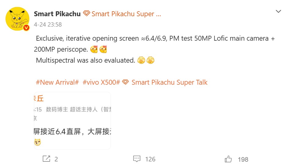 Dito isso, o Vivo X500 Pro poderia ter uma vantagem sobre o X300 Ultra em pelo menos uma área. O vazador Smart Pikachu afirma no Weibo que o novo sistema de câmera Zeiss suportará a tecnologia LOFIC, a mesma inovação que permite que o Xiaomi 17 Ultra produza imagens altamente dinâmicas. Espera-se que a nova câmera ultrawide de 50 MP seja combinada com uma lente teleobjetiva de 200 MP. O Vivo X500 Ultra potencialmente carregará o sensor multiespectral do X300 Ultra para obter cores mais naturais em condições desafiadoras.