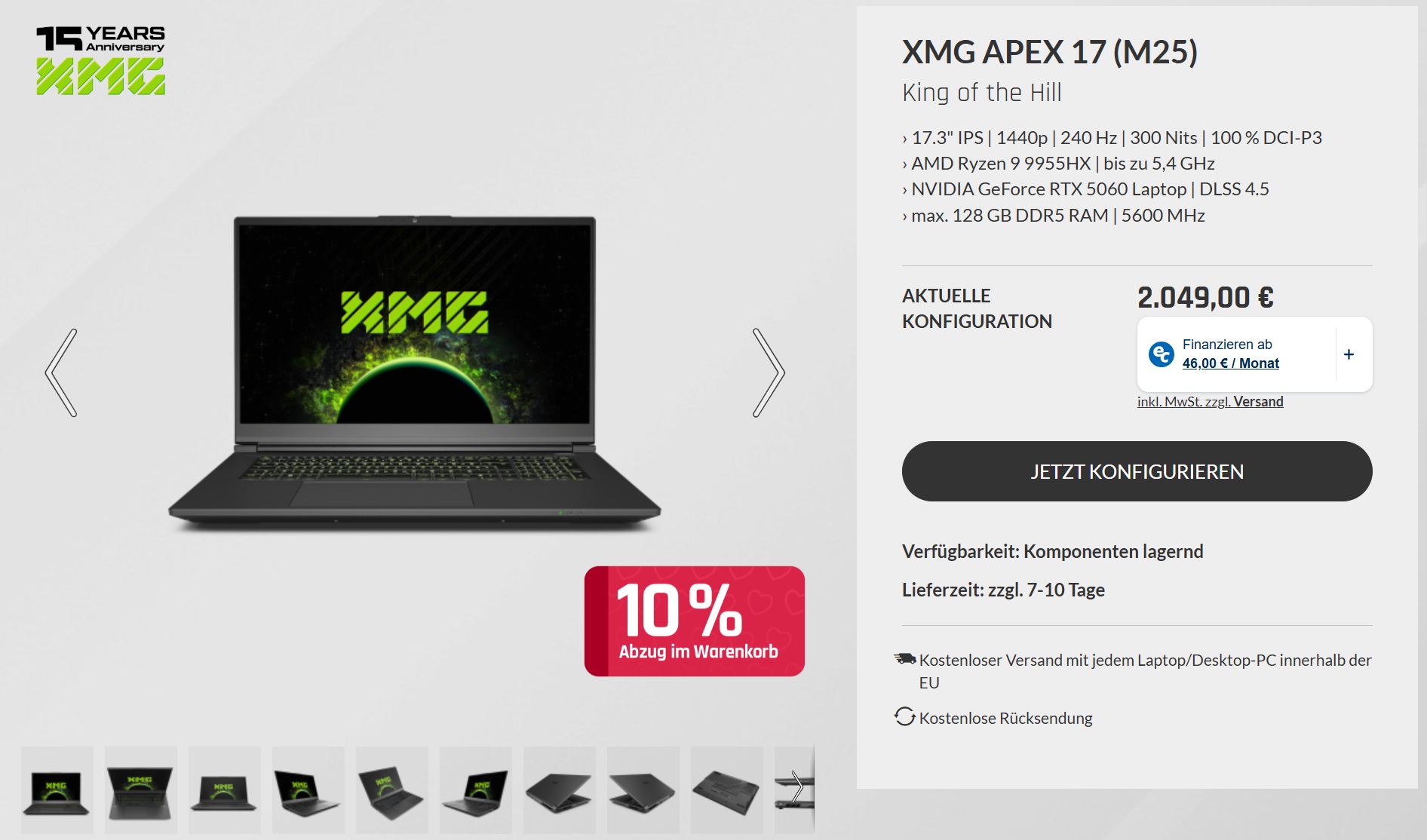 Aumento de preço do XMG Apex 17: o laptop RTX 5060 agora custa a partir de 2.049 euros