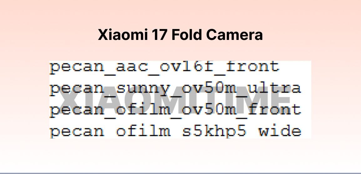 De acordo com o site XiaomiTimeo código do HyperOS inclui referências ao hardware da câmera do 'pecan', um suposto codinome para o Xiaomi 17 Fold. Como mostra a imagem abaixo, o pecan apresenta a S5KHP5 como sua câmera principal ou ampla. Abreviação de Samsung ISOCELL HP5, a S5KHP5 tem uma saída nativa de 200 MP e está programada para ser usada em dispositivos como o Find X9 Pro como uma câmera teleobjetiva.