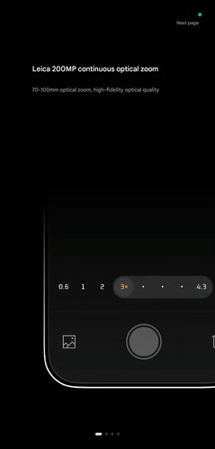 Nas imagens abaixo, além das posições usuais de zoom de 0,6x, 1x e 2x, também é possível ver uma faixa entre zoom 3x e zoom 4,3x, que parece cobrir distâncias focais entre 70 mm e 100 mm e é complementada por outro zoom de 8,6x. Além disso, o "zoom óptico contínuo Leica 200 MP" e a "qualidade óptica de alta fidelidade" são mencionados especificamente, portanto, a Xiaomi não está oferecendo uma faixa de zoom maior do que a da Xiaomi 15 Ultra, mas, aparentemente, um zoom de maior qualidade.